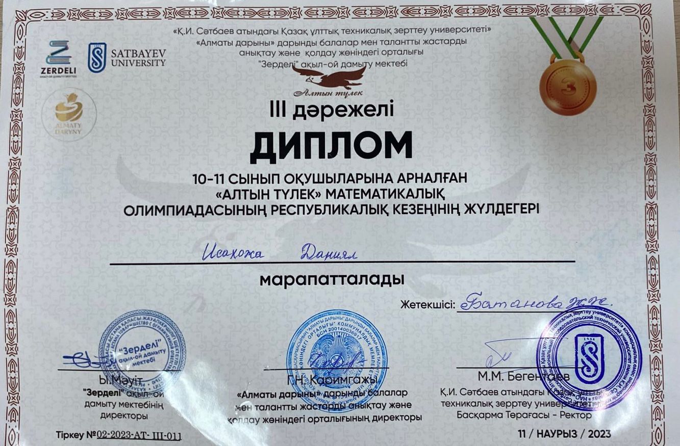 III дәрежелі диплом 10-11 сынып оқушыларына арналған «Алтын түлек»математикалық олимпиадасының республикалық кезеңінің жүлдегері Исахожа Даниял марапатталады👏🏻👏🏻👏🏻
