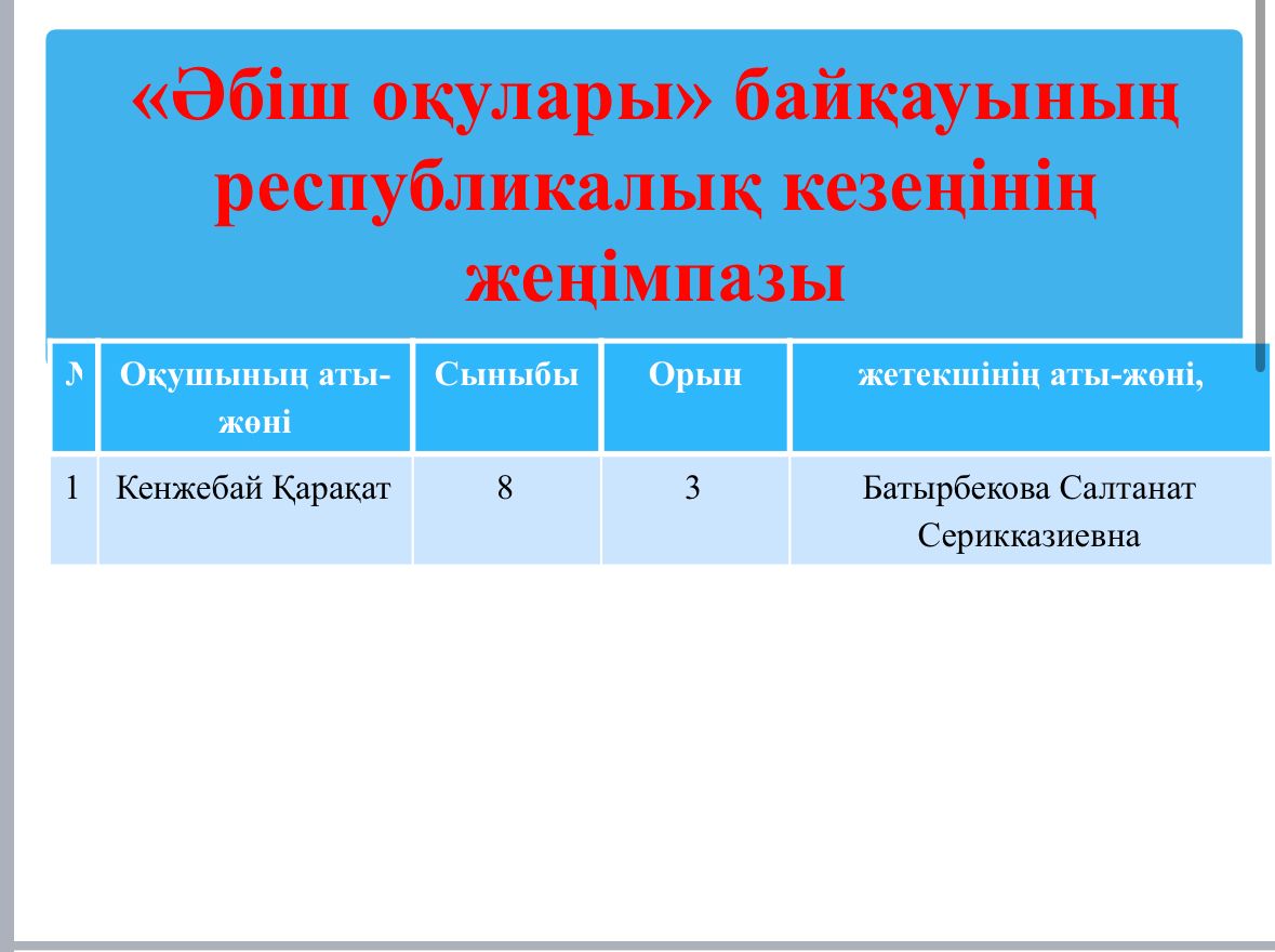 «Әбіш оқулары» байқауының республикалық кезеңінің жеңімпазы 8 сынып оқушысы Кенжебай Қарақатты құттықтаймыз!