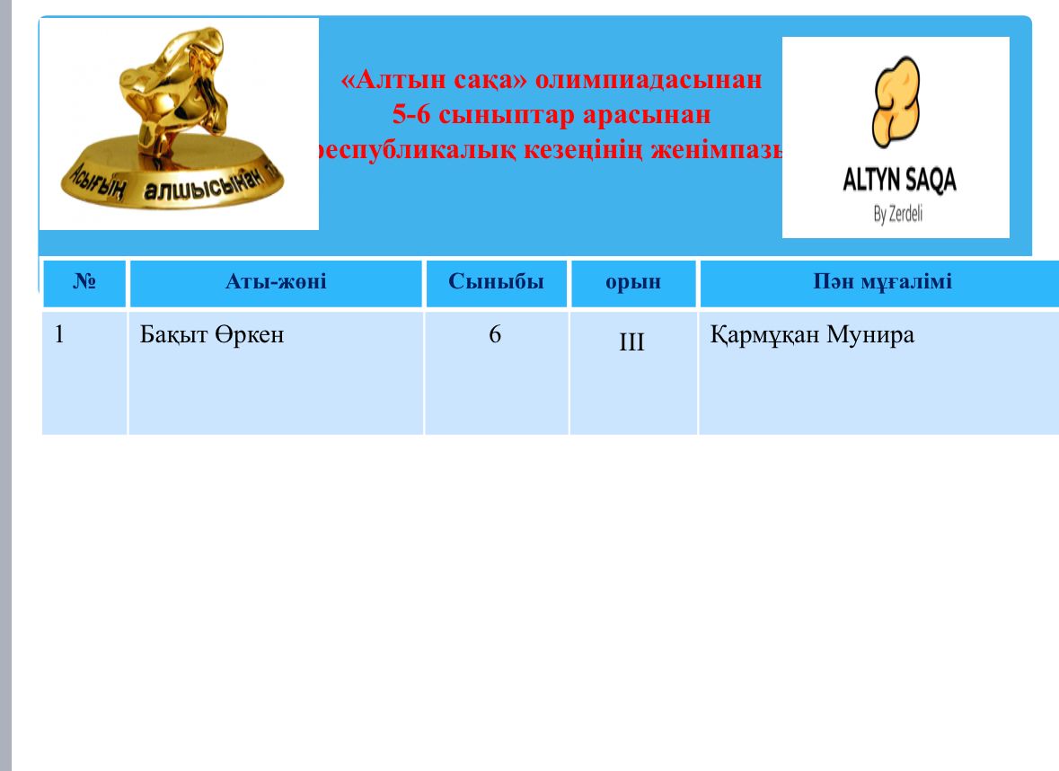 5-6 сыныптар арасында өткізілген «Алтын сақа» олимпиадасының республикалық кезеңінің 3 орын жеңімпазы 6 сынып оқушысы Бақыт Өркенді құттықтықтаймыз!