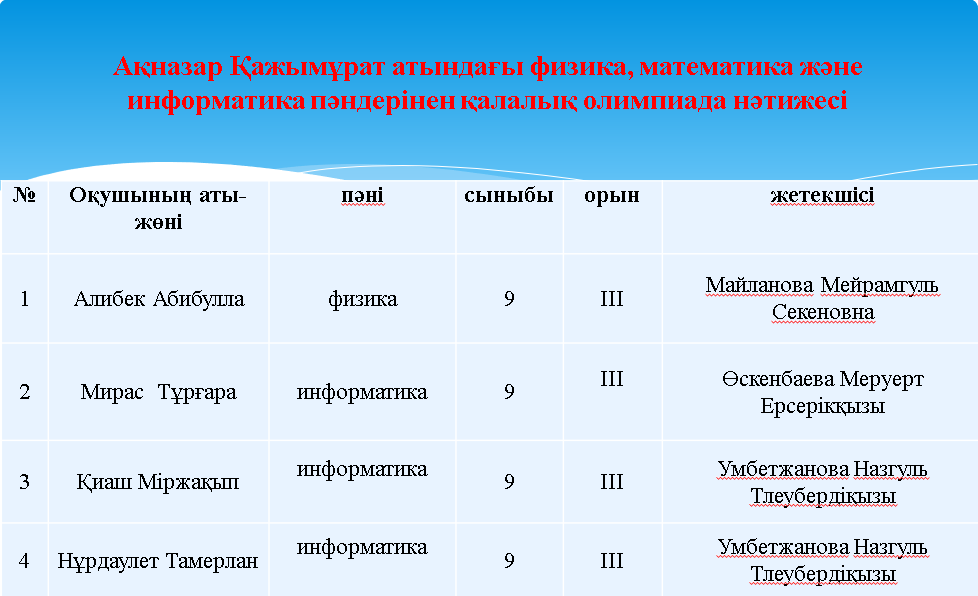 Ақназар Қажымұрат атындағы физика, математика және информатика пәндерінен қалалық олимпиададан оқушыларымыздың жетістіктері!!!!