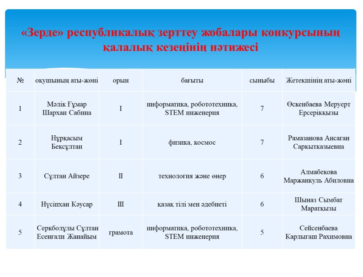 "Зерде" республикалық зерттеу жобалары конкурсының қалалық кезеніңде оқушыларымыз жүлделі орындарға ие болды. Құттықтаймыз!!!