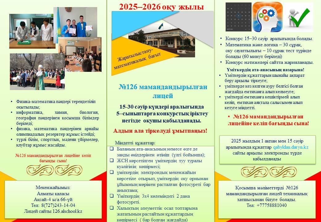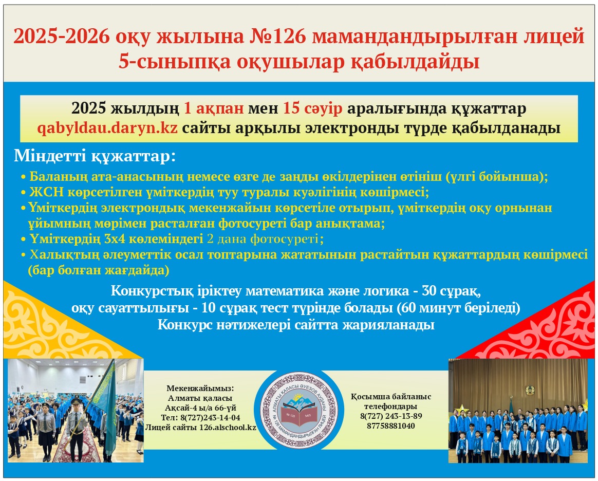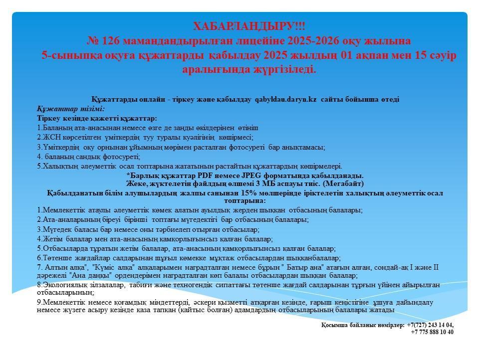 2025-2026 оқу жылына №126 мамандандырылған лицейге 5 сыныпқа түсу үшін құжаттарды қабылдау 1 ақпан мен 15 сәуір аралығында qabyldau.daryn.kz сайты арқылы жүргізіледі