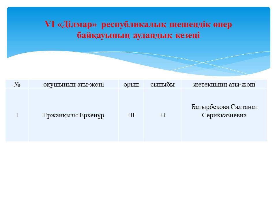 VI «Ділмар» республикалық шешендік өнер байқауының аудандық кезеңінде 11 сынып оқушысы Ержанқызы Еркенұр жүлделі III орын иеленді. Құттықтаймыз!!!