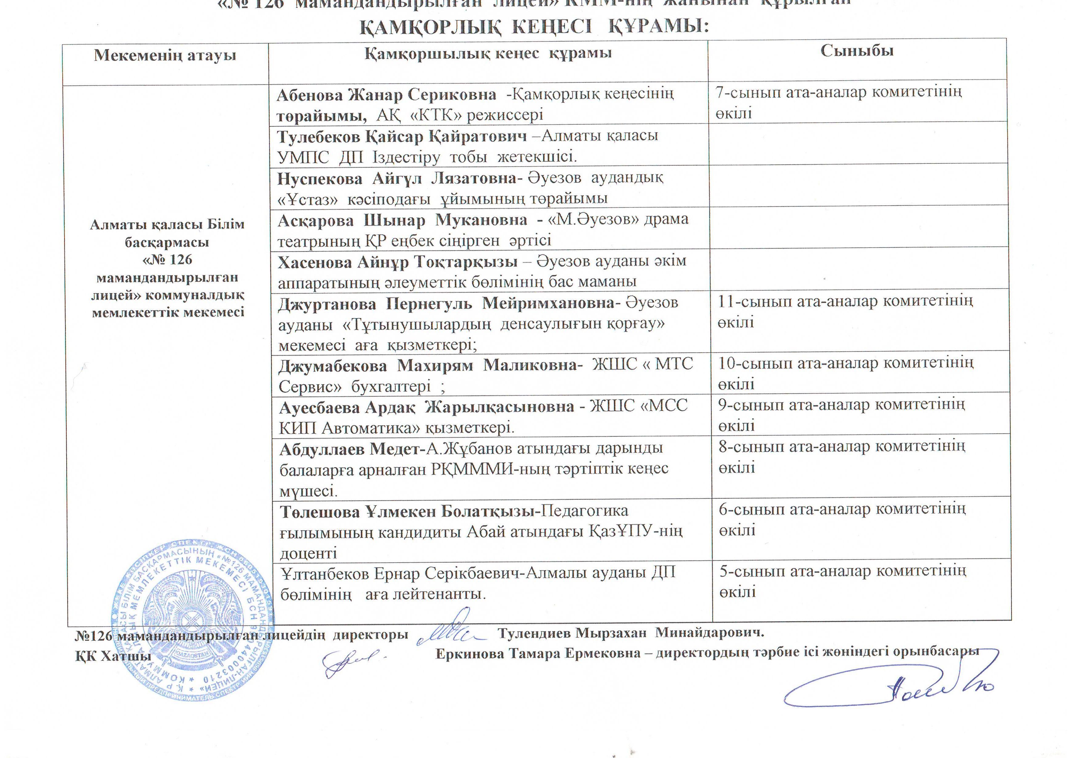 126.alschool » Ақпарат » «№126 мамандандырылған лицей» коммуналдық мемлекеттік мекемесінің Қамқоршылық кеңес құрамы 2023 ж.