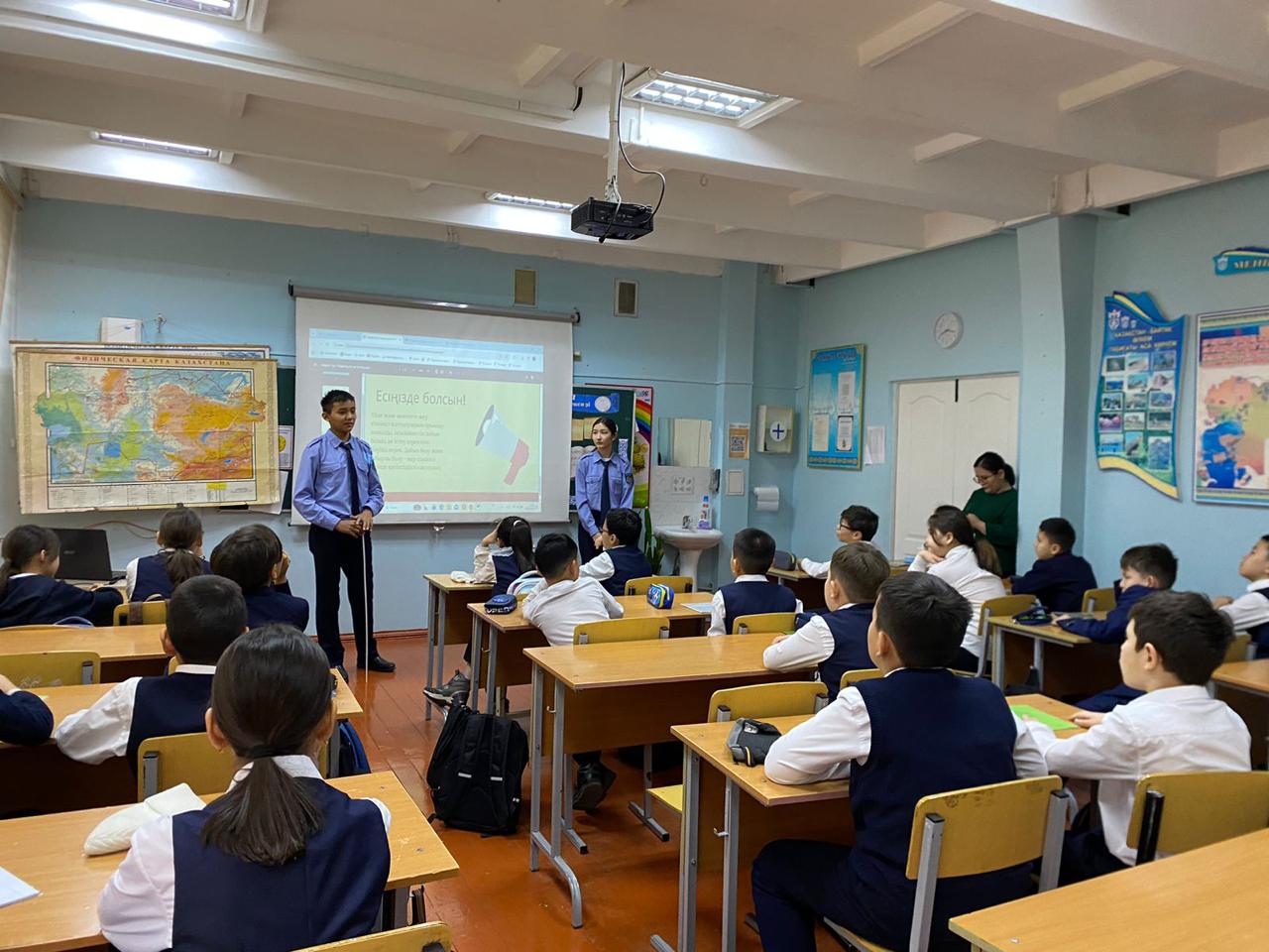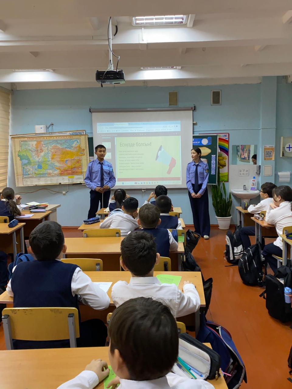 8 сынып оқушылары 5 сынып оқушыларына Жолда жүру ережесімен таныстырып, қауіпсіздік шараларын өткізді.