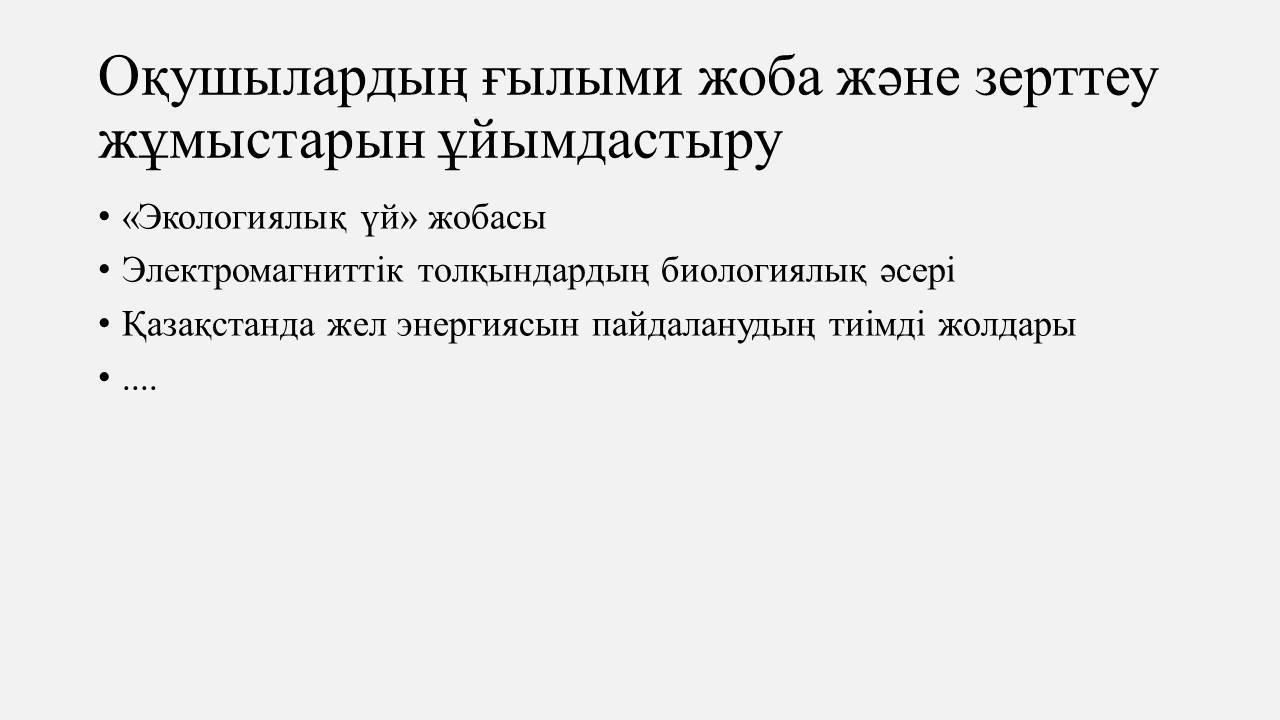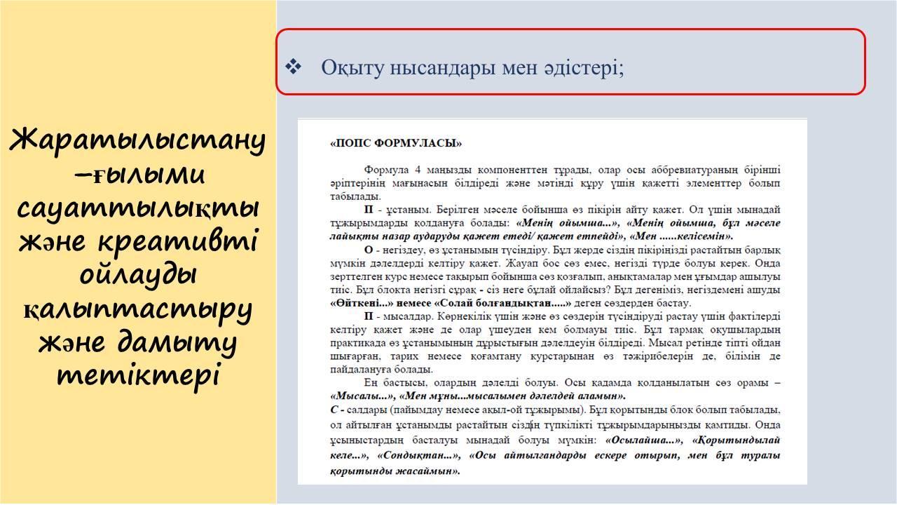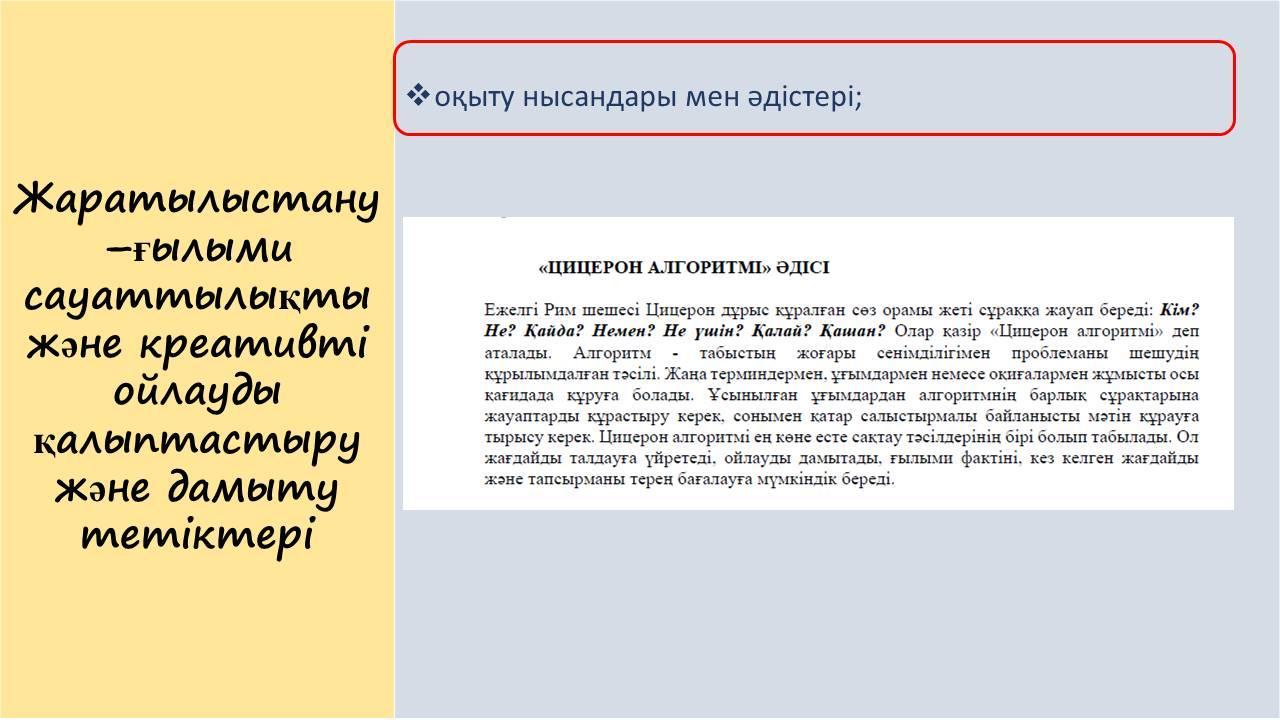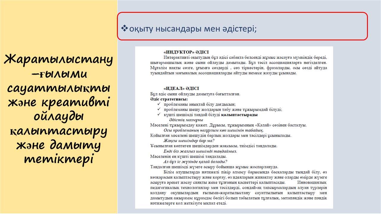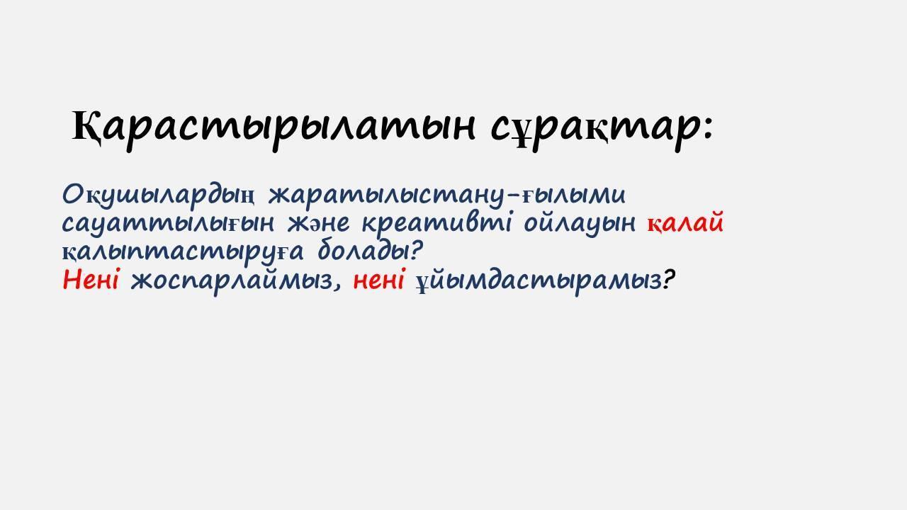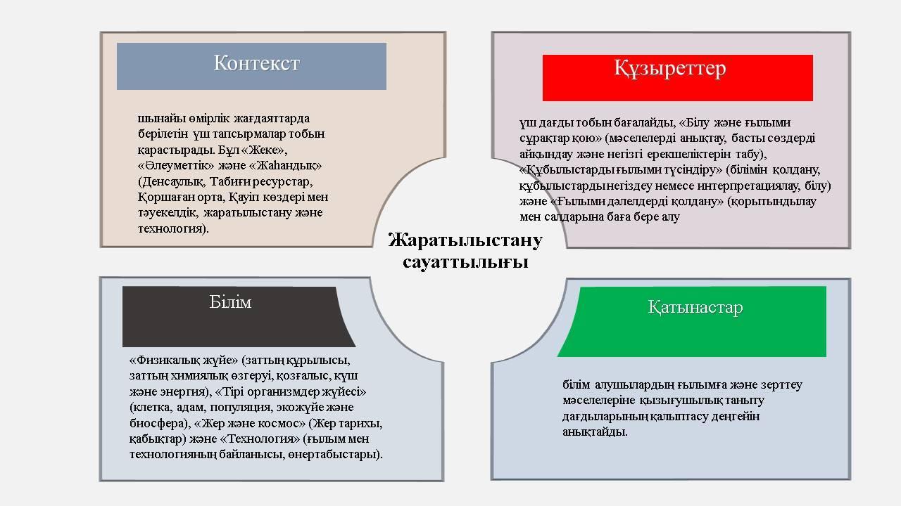 Қарастырылатын сұрақтар: Оқушылардың жаратылыстану-ғылыми сауаттылығын және креативті ойлауын қалай қалыптастыруға болады? Нені жоспарлаймыз, нені ұйымдастырамыз?