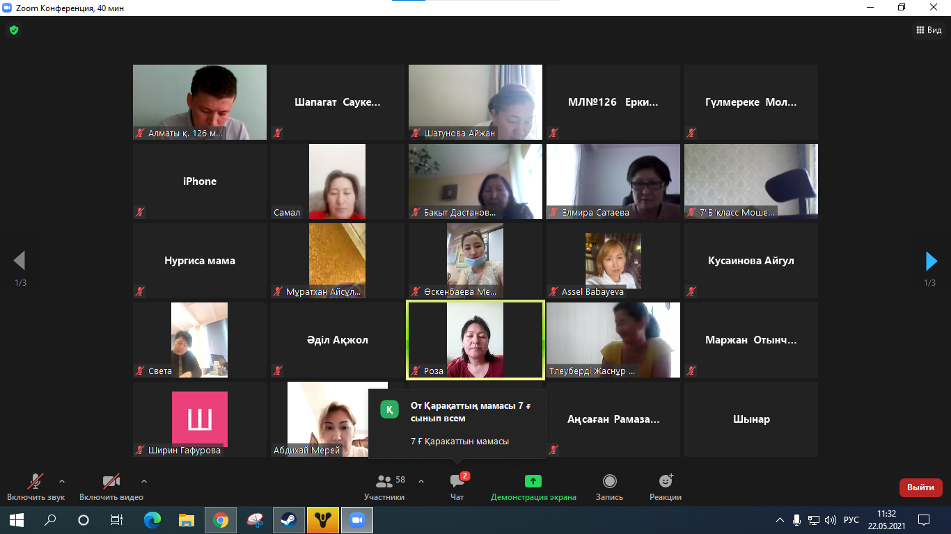 2020-2021 оқу жылының аяқталуын ұйымдастыру мақсатында №126 мамандандырылған лицейде жалпыреспубликалық ата-аналар жиналысы өткізілді. Жалпыреспубликалық ата-аналар жиналысының мақсаты – ата-аналарды 2020-2021 оқу жылының қорытындылары туралы хабардар ету және ата-ананың педагогтермен жеке сөйлесуі арқылы баланың үлгеріміне егжей-тегжейлі талдау жасауға мүмкіндік беру.