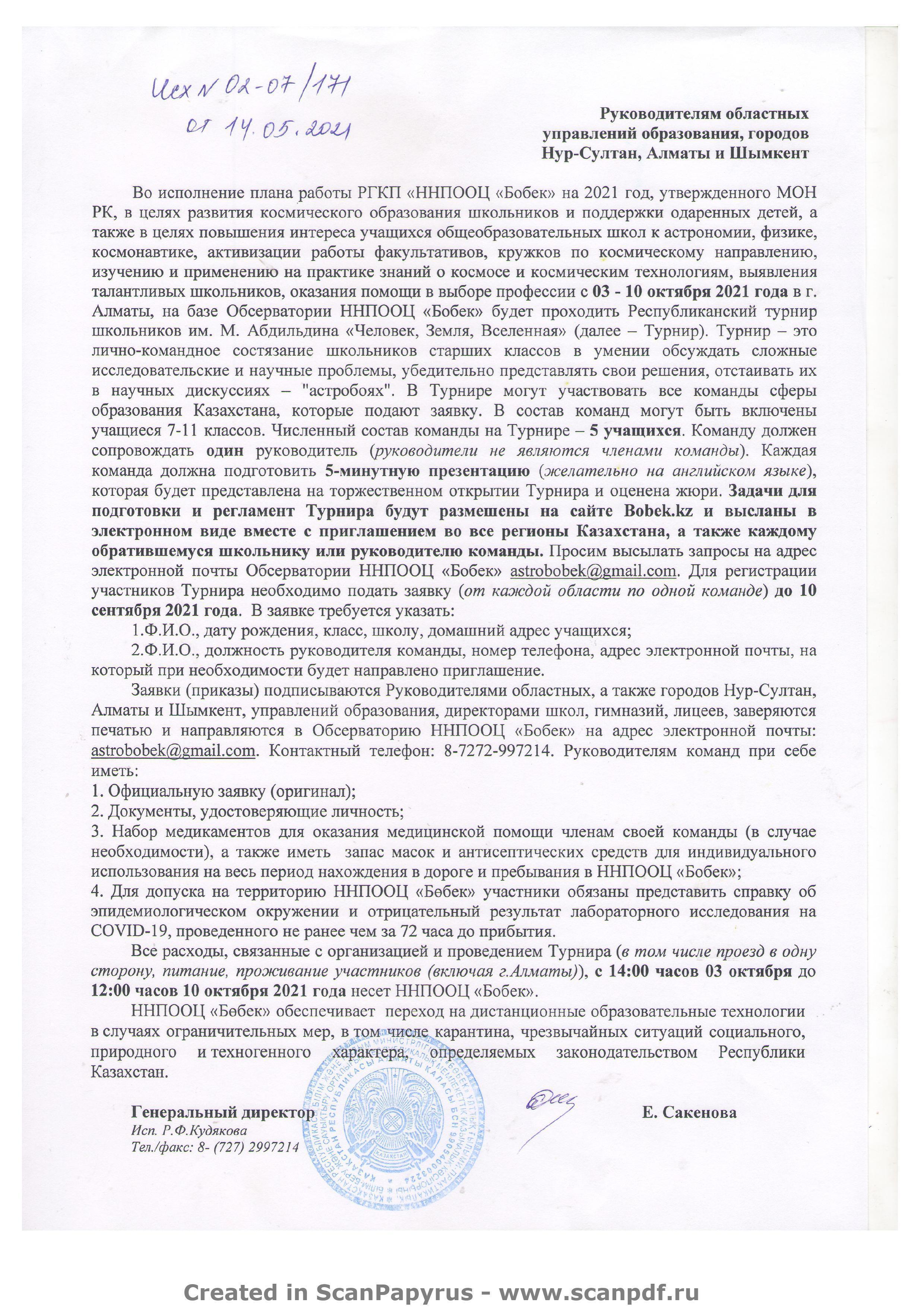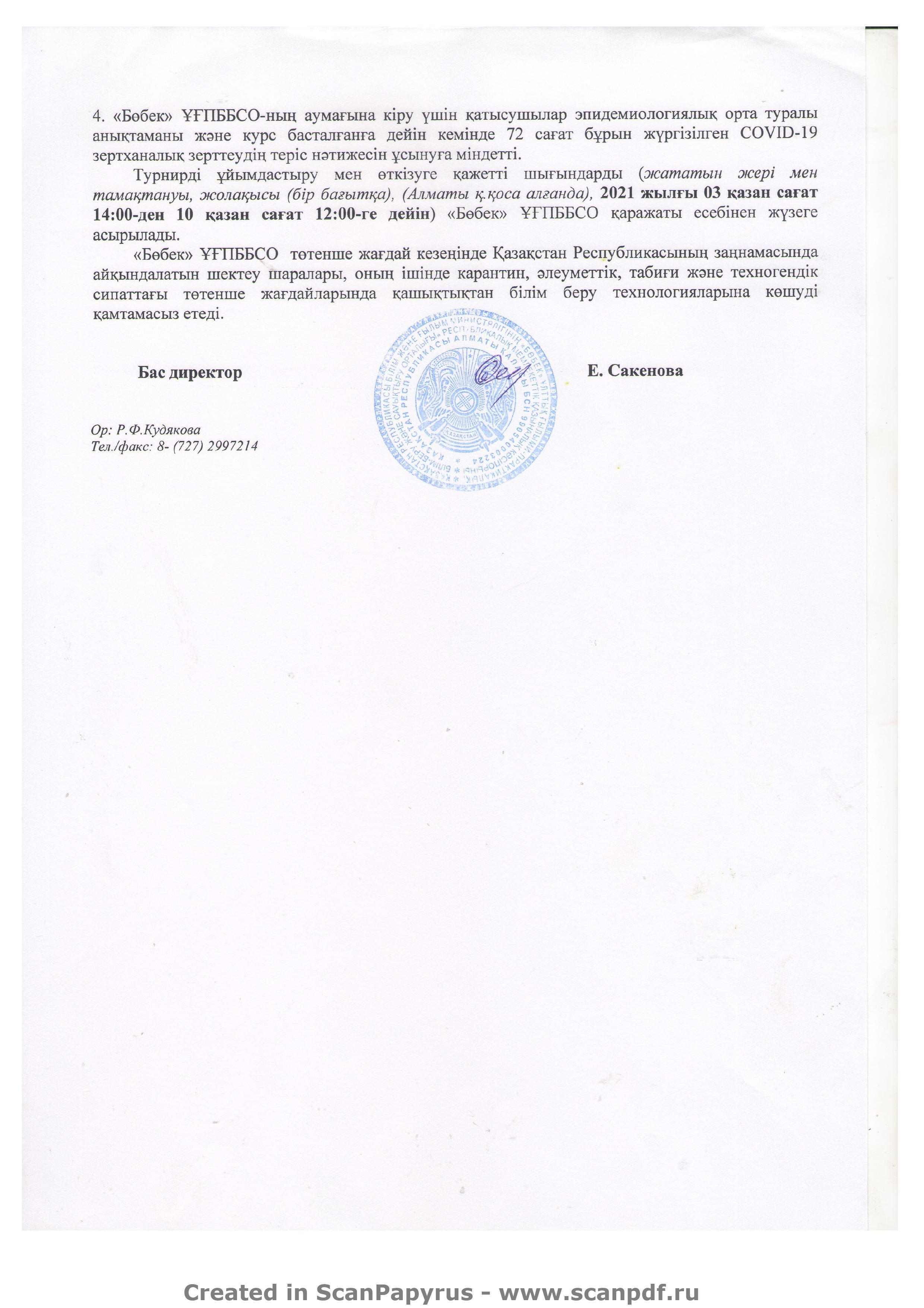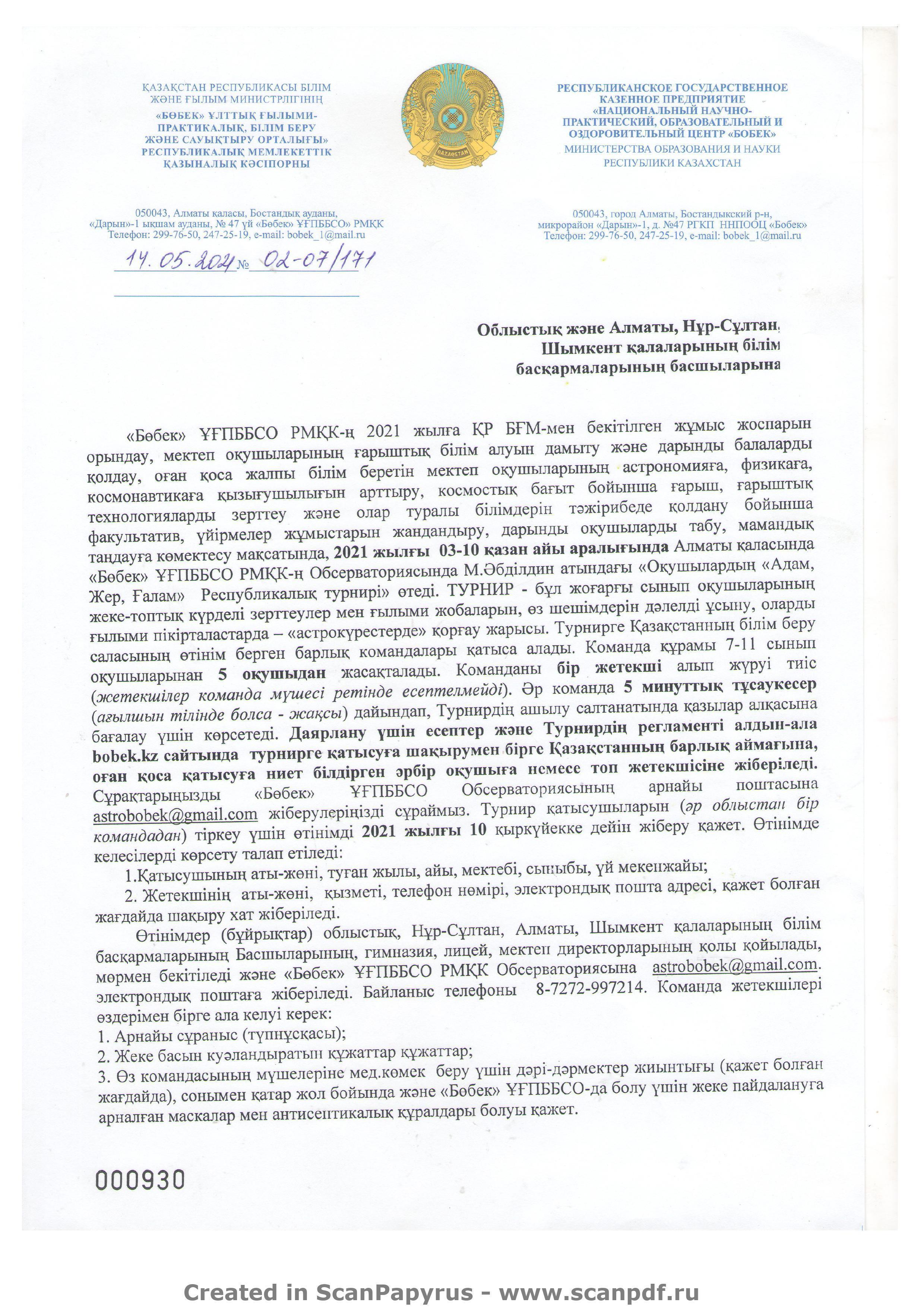 "Бөбек" ҰҒПББСО-ның ұйымдастыруымен 2021 жылдың 03-10 қазан айы аралығында астротурнир өткізіледі.