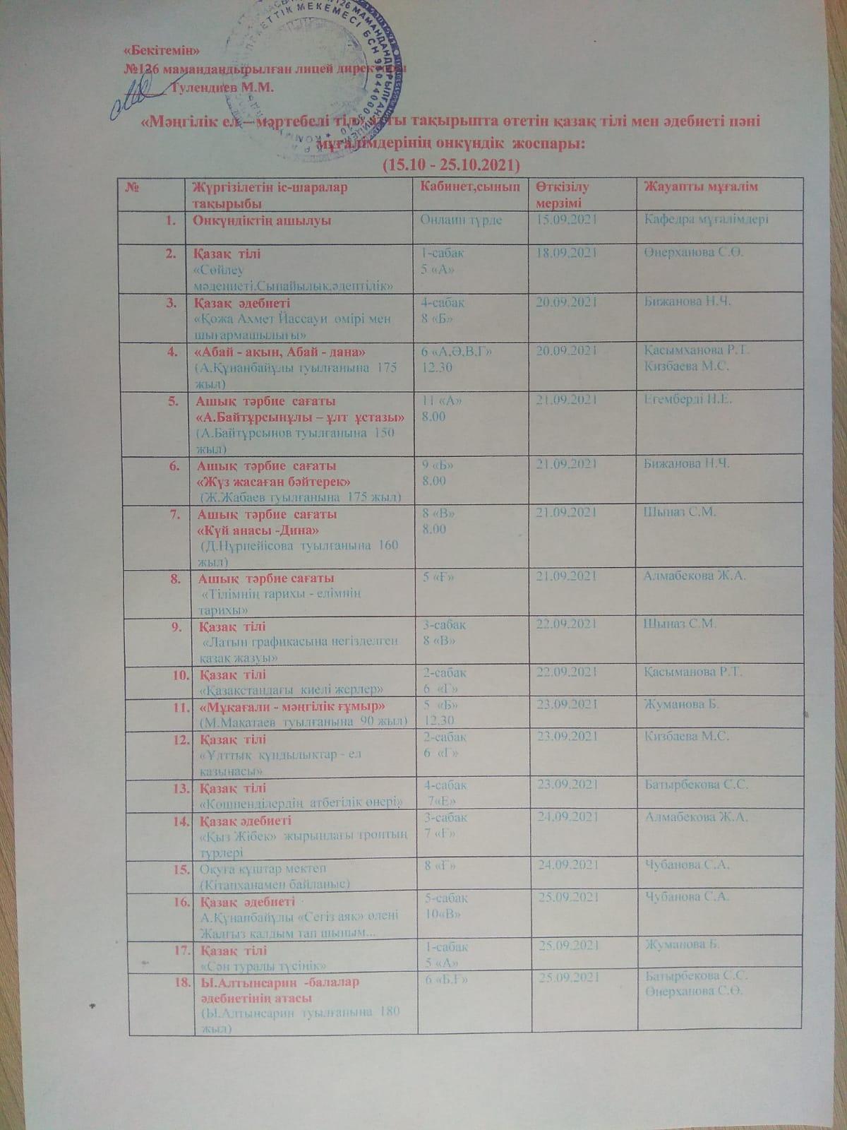 14 сентябрь 2021 0 1 2 3 4 5 Қазақ тілі мен әдебиеті пәні мұғалімдерінің онкүндігі 15.10 - 25.10.2021 "Мәңгілік ел - мәртебелі тіл" атты тақырыпта өтетін қазақ тілі мен әдебиеті пәні мұғалімдерінің онкүндік жоспары Осы беттің QR-коды:QR-код этой страницы: