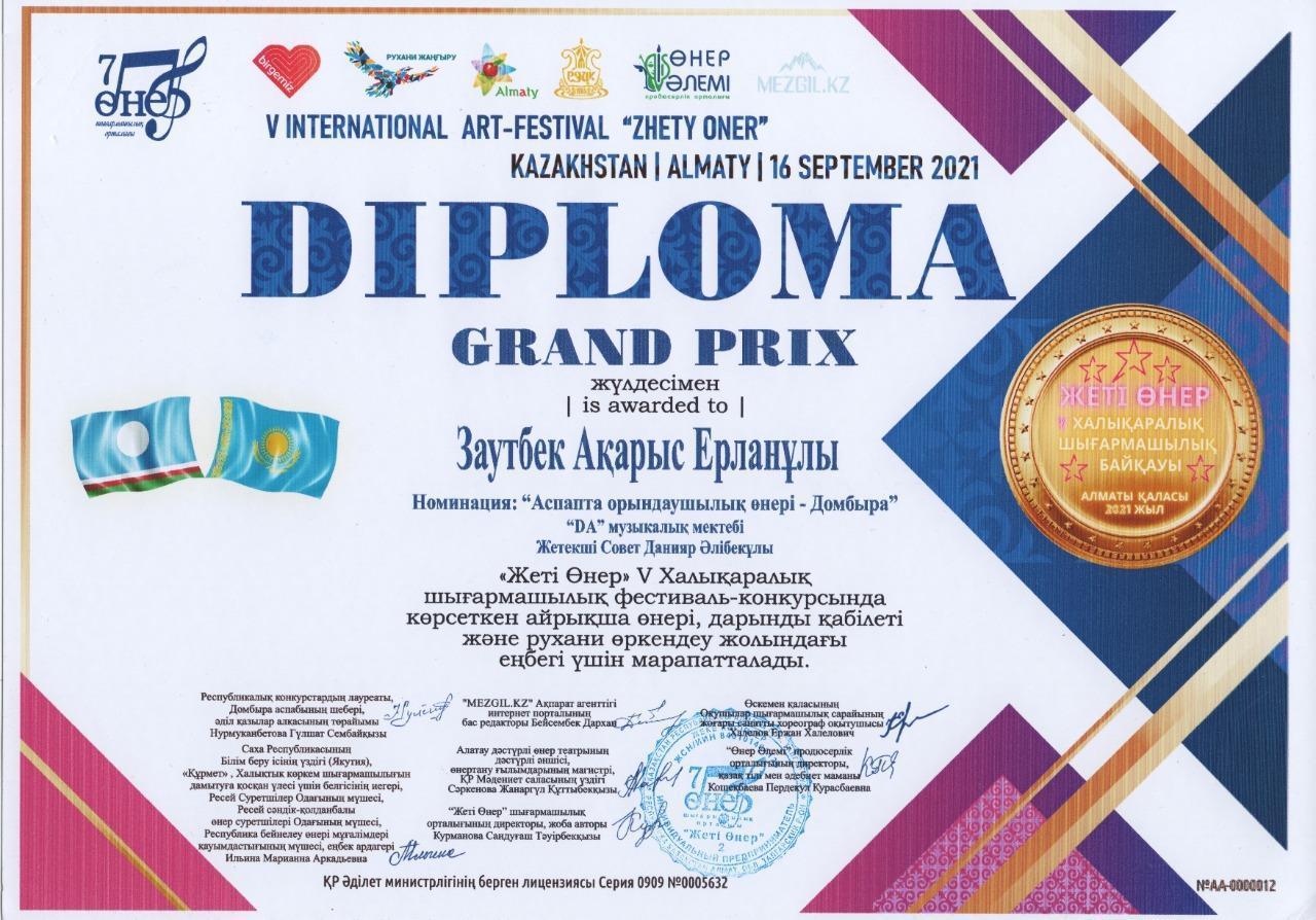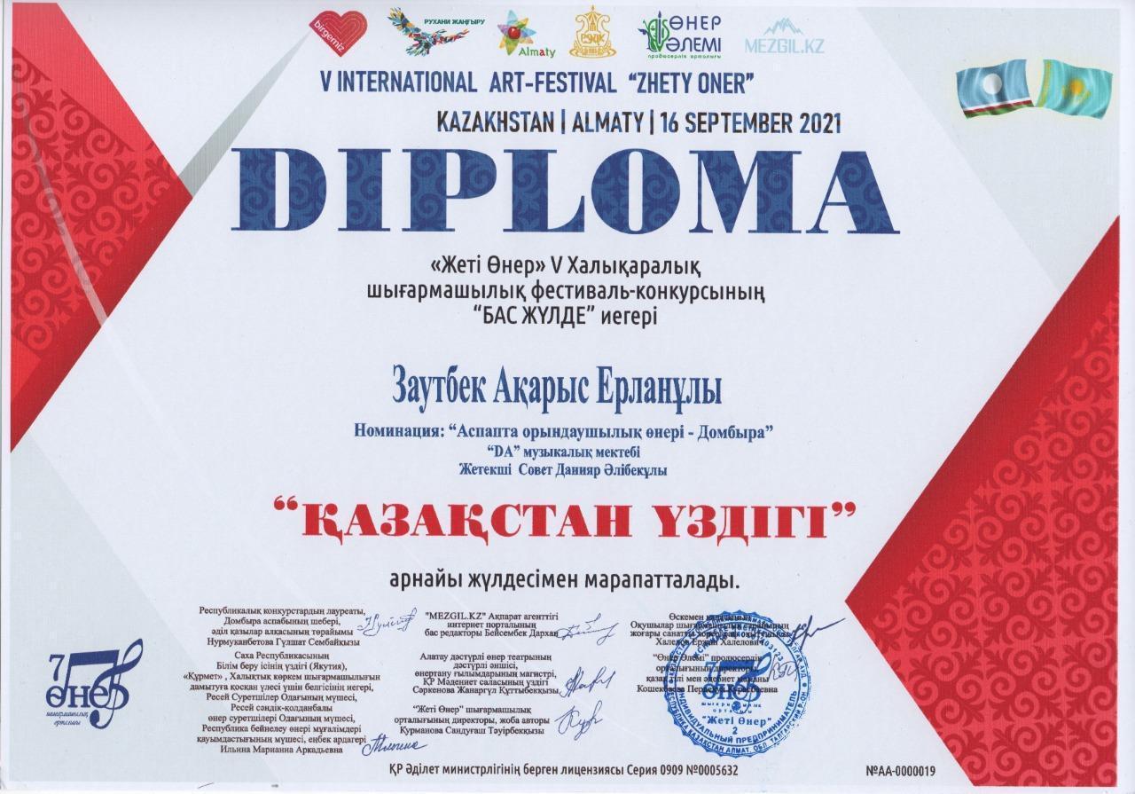 "Жеті Өнер" V Халықаралық шығармашылық фестивалі - конкурсында көрсеткен айрықша өнері, дарынды қабілеті және рухани өркендеу жолындағы еңбегінің арқасында 8 "Г" сынып оқушысы Зауытбек Ақарыс БАС ЖҮЛДЕ иеленді. ҚҰТТЫҚТАЙМЫЗ!!!
