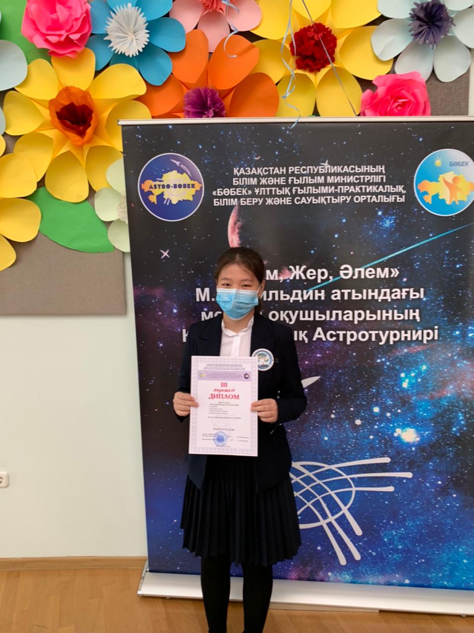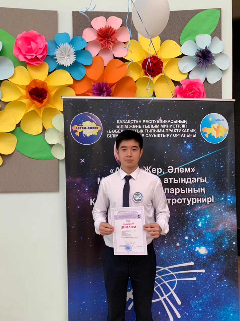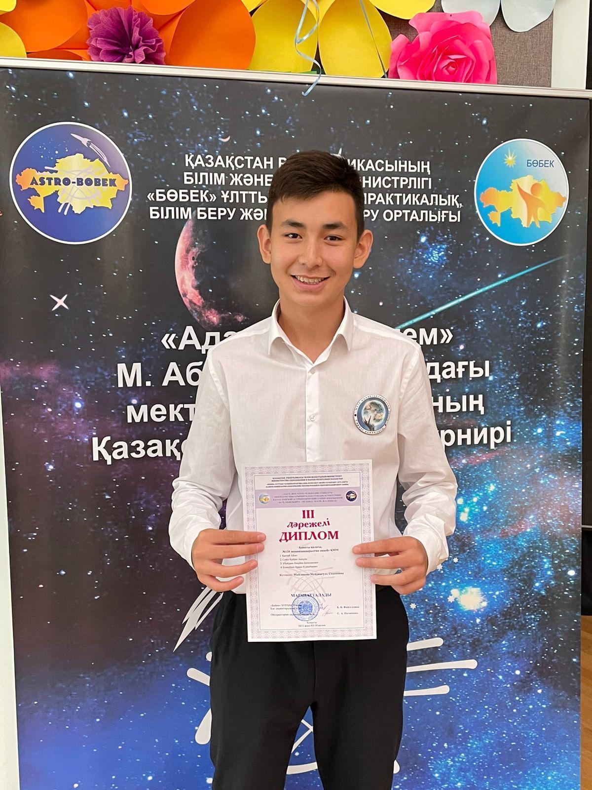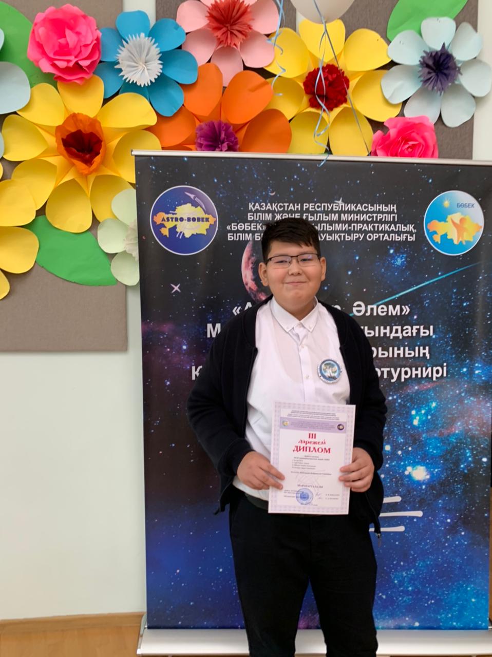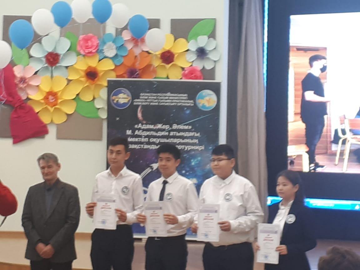 "АДАМ,ЖЕР,ӘЛЕМ" М.Әбділдин атындағы мектеп оқушыларының Қазақстандық Республикалық Астротурниріне 10"Г" сынып оқушылары Қазтай Айзат,Совет Қайрат,Убайдаев Өмірбек және 8"А" сынып оқушысы Кенесбаев Арман қатысып lll ші дәрежелі Дипломмен марапатталды. Пән мұғалімдері физика пәнінің мұғалімдері Майланова Мейрамгуль Секеновна және Муканова Гүлбақыт Маралхановна.