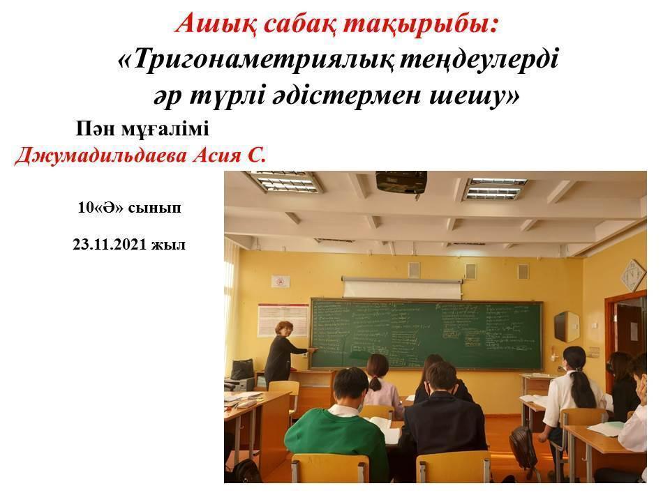 23 ноябрь 2021 0 1 2 3 4 5 Математика пәнінің онкүндігі 17.11-27.11.2021 жыл Ашық сабақ "Тригонометриялық теңдеулерді әртүрлі әдістермен шешу" Пән мұғалімі: А.С.Джумадильдаева Осы беттің QR-коды:QR-код этой страницы: