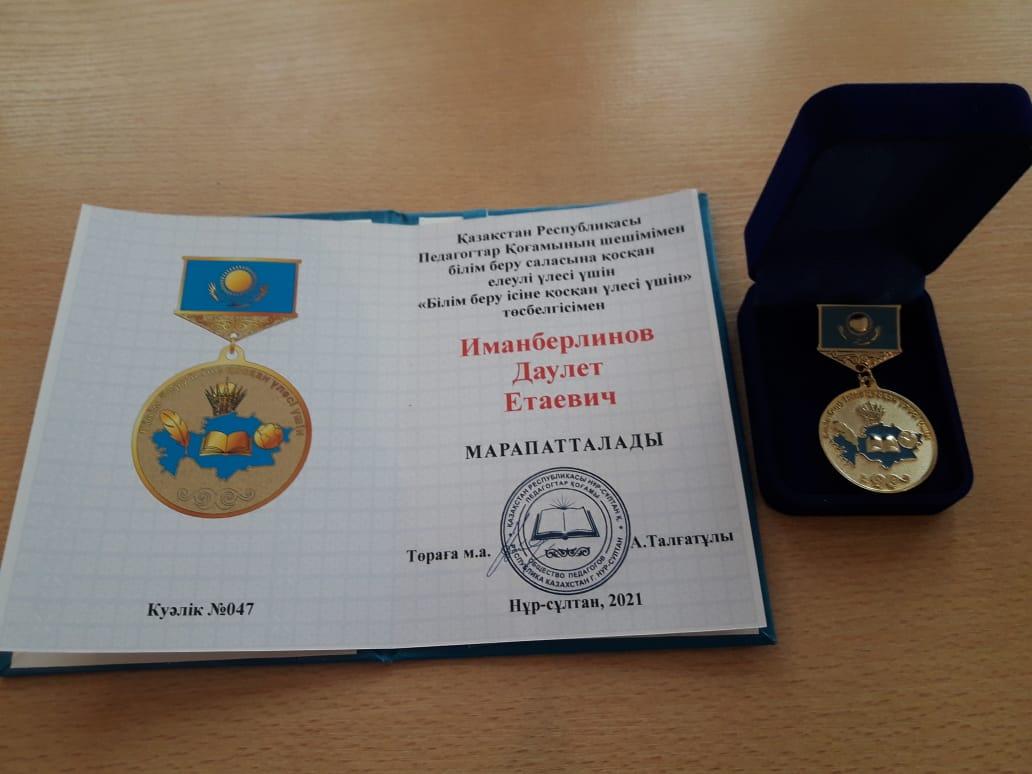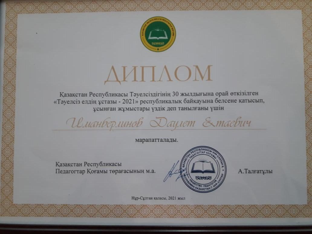 №126 мамандандырылған лицейдің ұстазы Иманберлинов Даулет Ертаевичты Қазақстан Республикасы Тәуелсіздігінің 30 жылдығына орай өткізілген «Тәуелсіз елдің ұстазы-2021» республикалық байқауына белсене қатысып, ұсынған жұмыстар үздік деп танылған үшін «Білім беру ісіне қосқан үлесі үшін» төсбелгісімен құттықтаймыз.