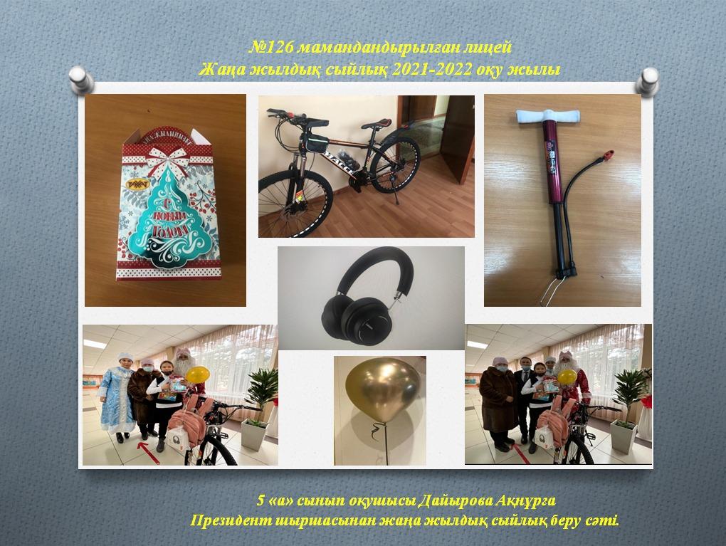 Бүгін №126 мамандандырылған лицейдің 5 "А" сынып оқушысы Дайырова Ақнұрға Қазақстан Республикасы Президентінің атынан ұйымдастырылатын жаңа жылдық шыршаға орай №126 мамандандырылған лицей директоры М.М.Тулендиев сыйлық табысталды.