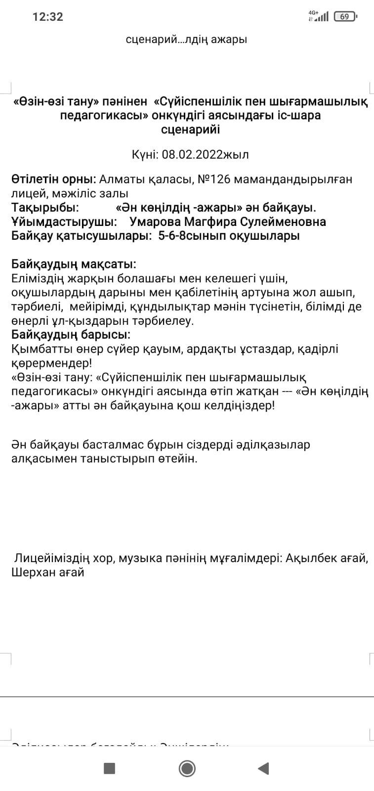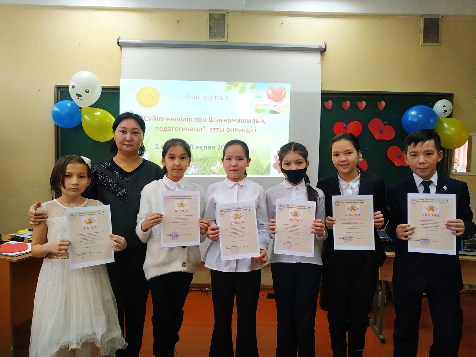 2022 жылдың 8 ақпан күні Өзі-өзі тану пәні бойыша «Сүйіспеншілік пен Шығармашылық педагогикасы» атты онкүндік декадасында «Ән көңілдің ажары» әндер байқауы болып өтті. Байқауға 5-6 сынып оқушылары қатысып, өз өнерлерін көрсетті. Әр оқушы өз өнерлерін жанды дауыста орындады.