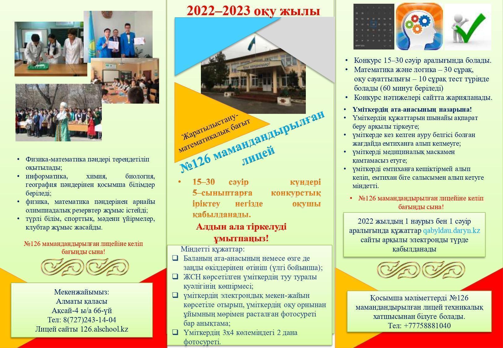 16 февраль 2022 0 1 2 3 4 5 №126 мамандандырылған лицейіне 2022-2023 жж. оқу жылына құжаттарды қабылдау басталады!!! Осы беттің QR-коды:QR-код этой страницы: