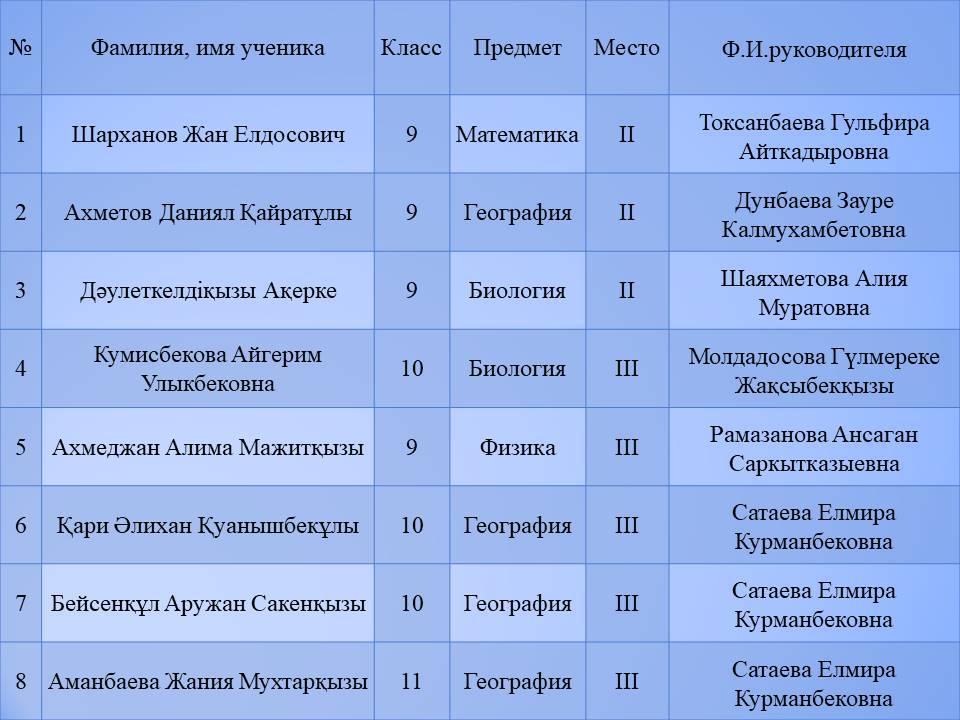 24-30 наурыз аралығында жалпы білім беретін пәндер бойынша республикалық олимпиаданың қалалық кезеңінде мектебіміздің оқушылары 17 жүлделі орындарға ие болды