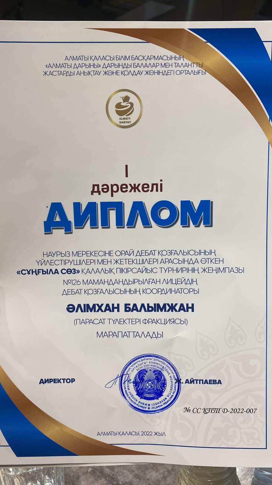 Алматы қаласы Білім басқармасының ,,Алматы дарыны” дарынды балалар мен талантты жастарды анықтау және қолдау орталығы дебат қозғалысының үйлестірушілері мен жетекшілері арасында ,,Сұңғыла сөз” қалалық пікірсайыс турнирін ұйымдастырды. #126 мамандандырылған лицейдің дебат қозғалысының кординаторы Әлімхан Балымжан осы турнирде I дәрежелі дипломға ие болды. #126 мамандандырылған лицей ұжымы сізді жеңісіңізбен құттықтайды. Тек биіктен көріне беріңіз.
