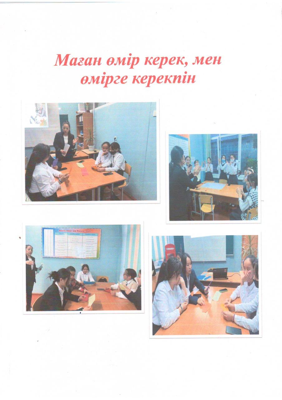 №126 мамандандырылған лицейінде қазан айының 15 күні "Маған өмір керек, мен өмірге керекпін" атты тренинг жүргізілді. Бұл тренингке лицейіміздің 7-11 сынып оқушылары қатысып, өмірдің қымбаттылығын сезініп, әр адам баласы өз отбасына, достарына қажеттілігін түсінді. Тренингте көптеген ситуациялық сұрақтар беріліп оның шешу жолдары қарастырылды.