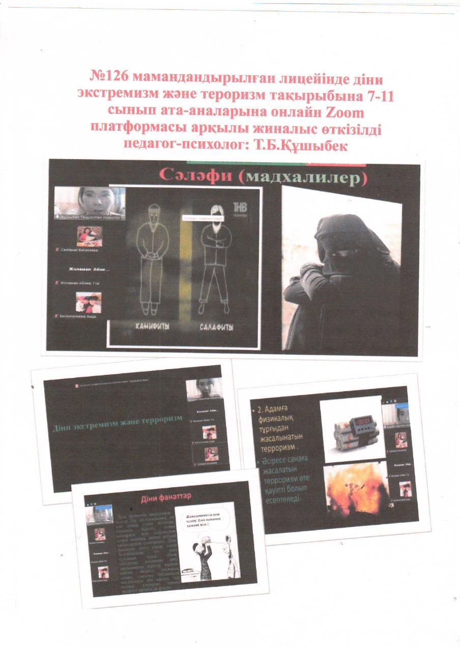 №126 мамандандырылған лицейінде діни экстремизм және тероризм тақырыбына 7-11 сынып ата-аналарына онлайн Zoom платформасы арқылы жиналыс өткізілді педагог-психолог: Т.Б. Құшыбек