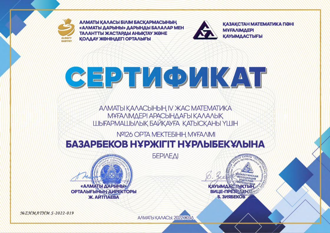 09 апрель 2022 0 1 2 3 4 5 Алматы қаласының жас математика мұғалімдері арасындағы қалалық шығармашылық байқауы Базарбеков Нұржігіт! Ұстаздық жолындағы қажырлы еңбегіңізге шығармашылық табыс тілейміз! Осы беттің QR-коды:QR-код этой страницы:
