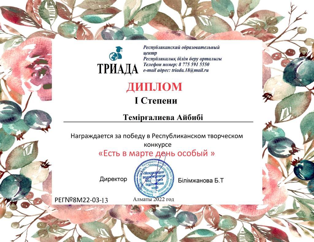 Республикалық білім беру орталығының ұйымдастыруымен "Есть в марте день особый" шығармашылық конкурсында Исқали Жұлдыз және Темірғалиева Айбибі І-дәрежелі дипломмен марапатталды. Исқали Жұлдыз бен Темірғалиева Айбибіні және жетекшісі Долдашев Рабхат ағайды құттықтаймыз!!!