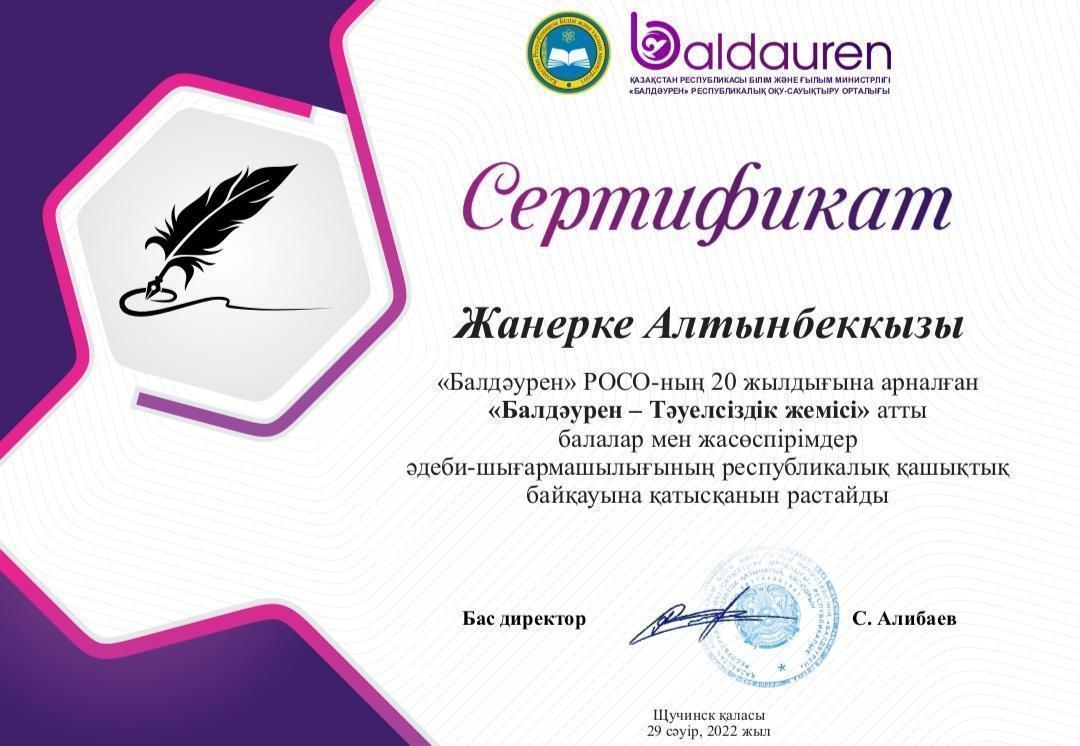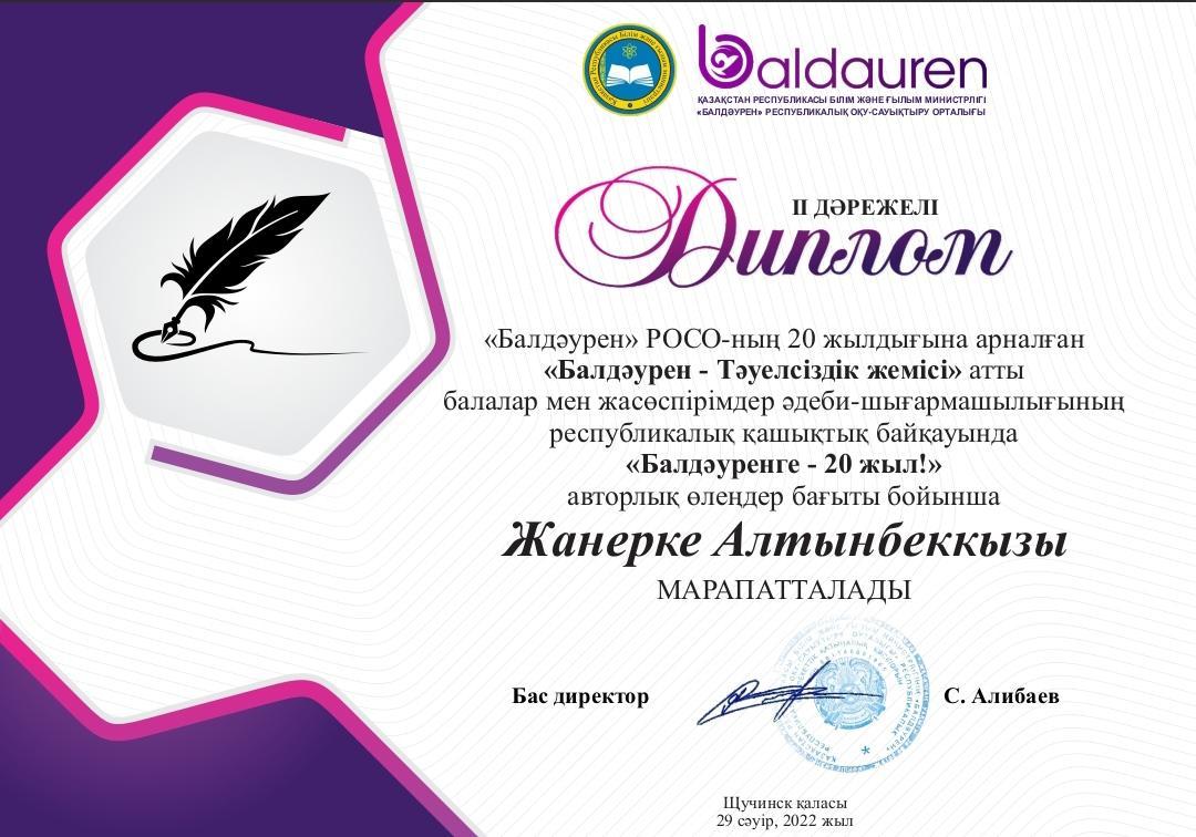 «Балдəурен» РОСО-ның 20 жылдығына арналған «Балдəурен - Тəуелсіздік жемісі» атты балалар мен жасөспірімдер əдеби-шығармашылығының республикалық қашықтық байқауында «Балдəуренге - 20 жыл!»