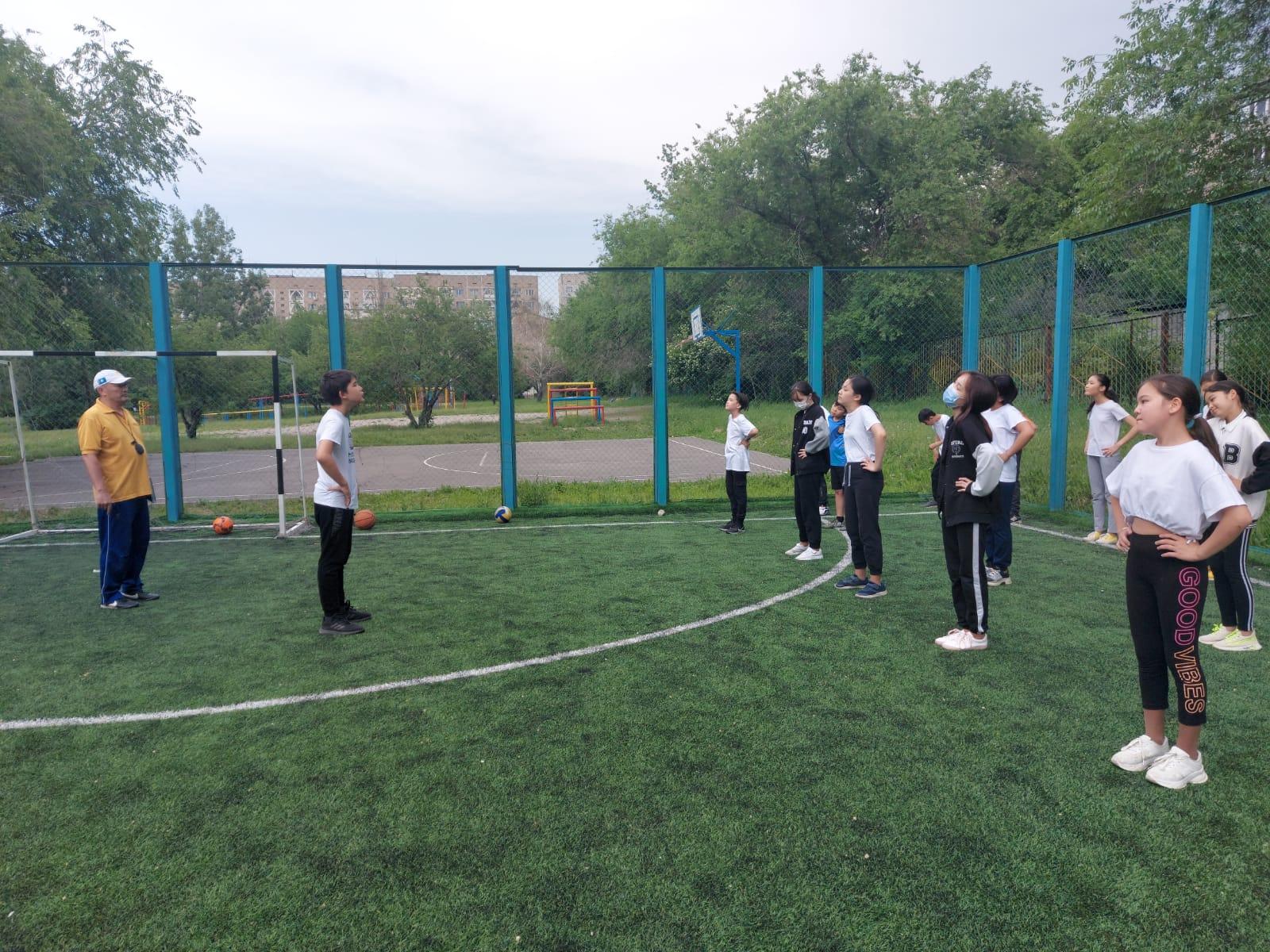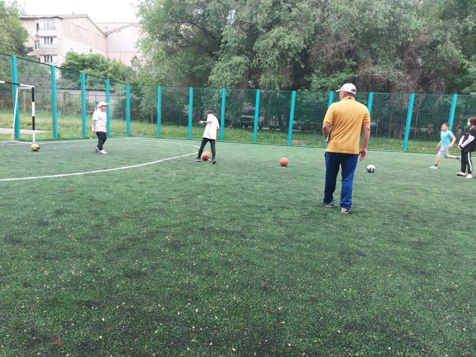 Эстетикалық пәндер кафедрасының онкүндігі. 10.05.2022 ж. дене шынықтыру пәнінің мұғалімі Джартыбаев Шыракбек Абишевич 6"В" сыныбына "Допты нысаналар қақпаға тебу. ҚО допты ұарсыласұа бермеу" тақырыбында ашық сабақ өтті.