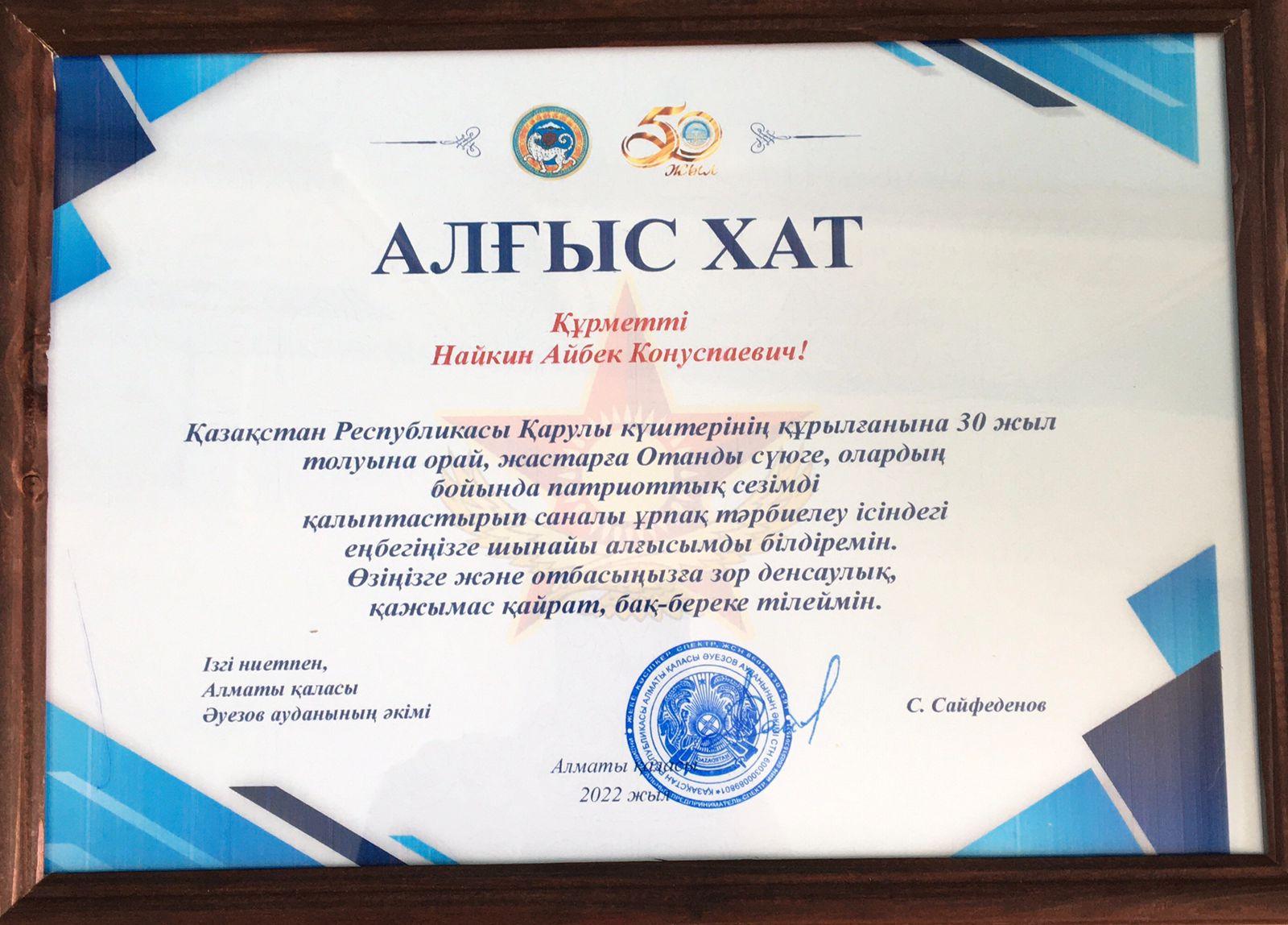 Қарулы күштерінің 30 жыл толуына орай және жоғары оқудағы жетістіктерге жеткені үшін мұғалімдер күне орай Әуезов ауданының әкімнің Алғыс хатмен №126 мамандандырылған лицейінің Әскери дайындық пәнінің мұғалімі Найкин Айбек Конуспаевич марапатталады