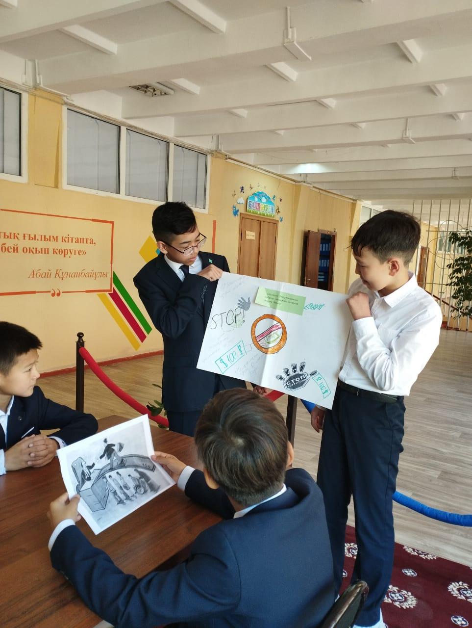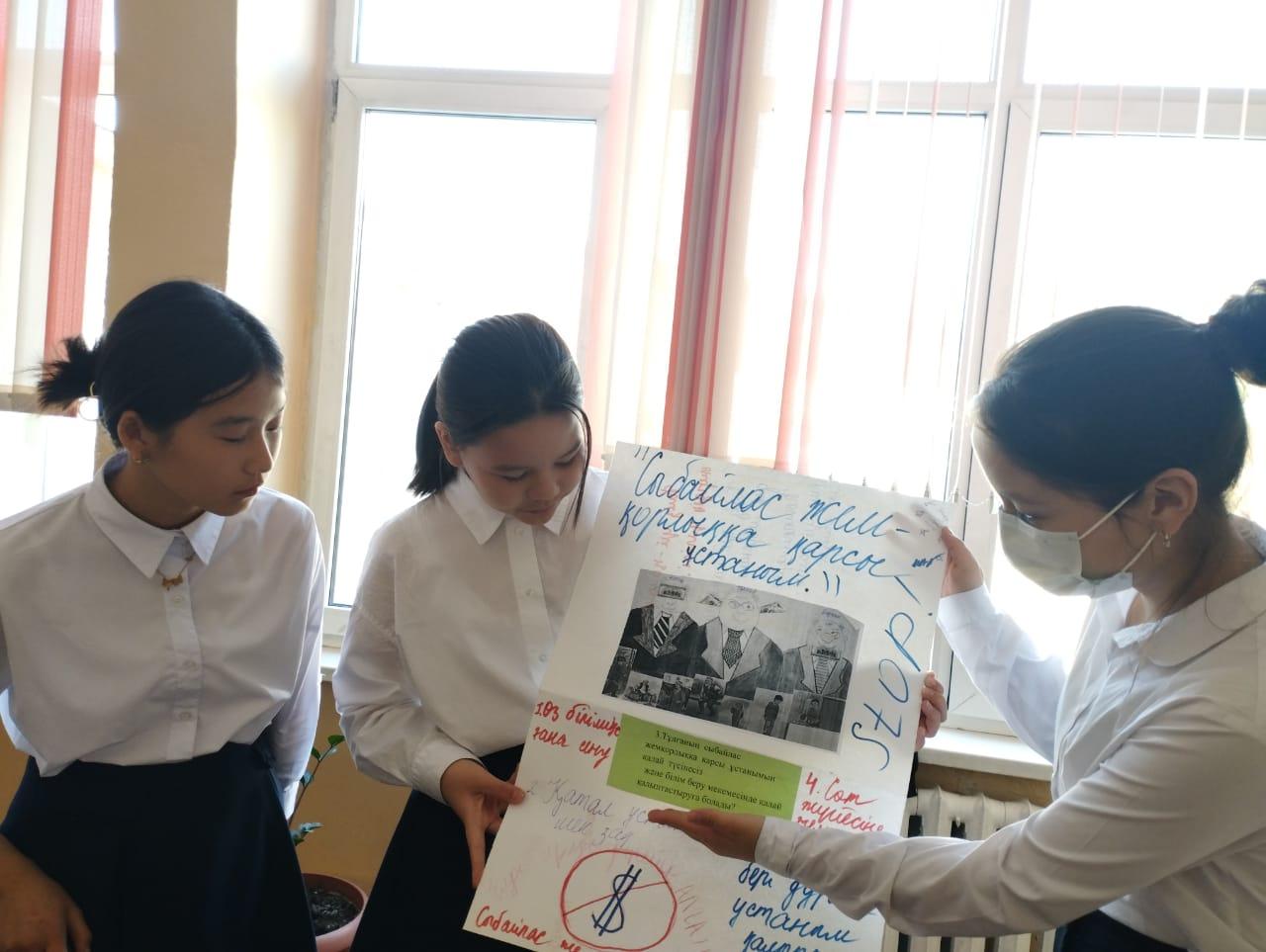 7,,а” сынып оқушылары,, Сыбайлас жемқорлыққа қарсымын” атты тақырыпта пікір алмасты. Әр оқушы өз ойларын қағаз беттеріне түсіріп, бір-бірімен ой бөлісті. Сынып жетекшісі Ж.Аязбекова.