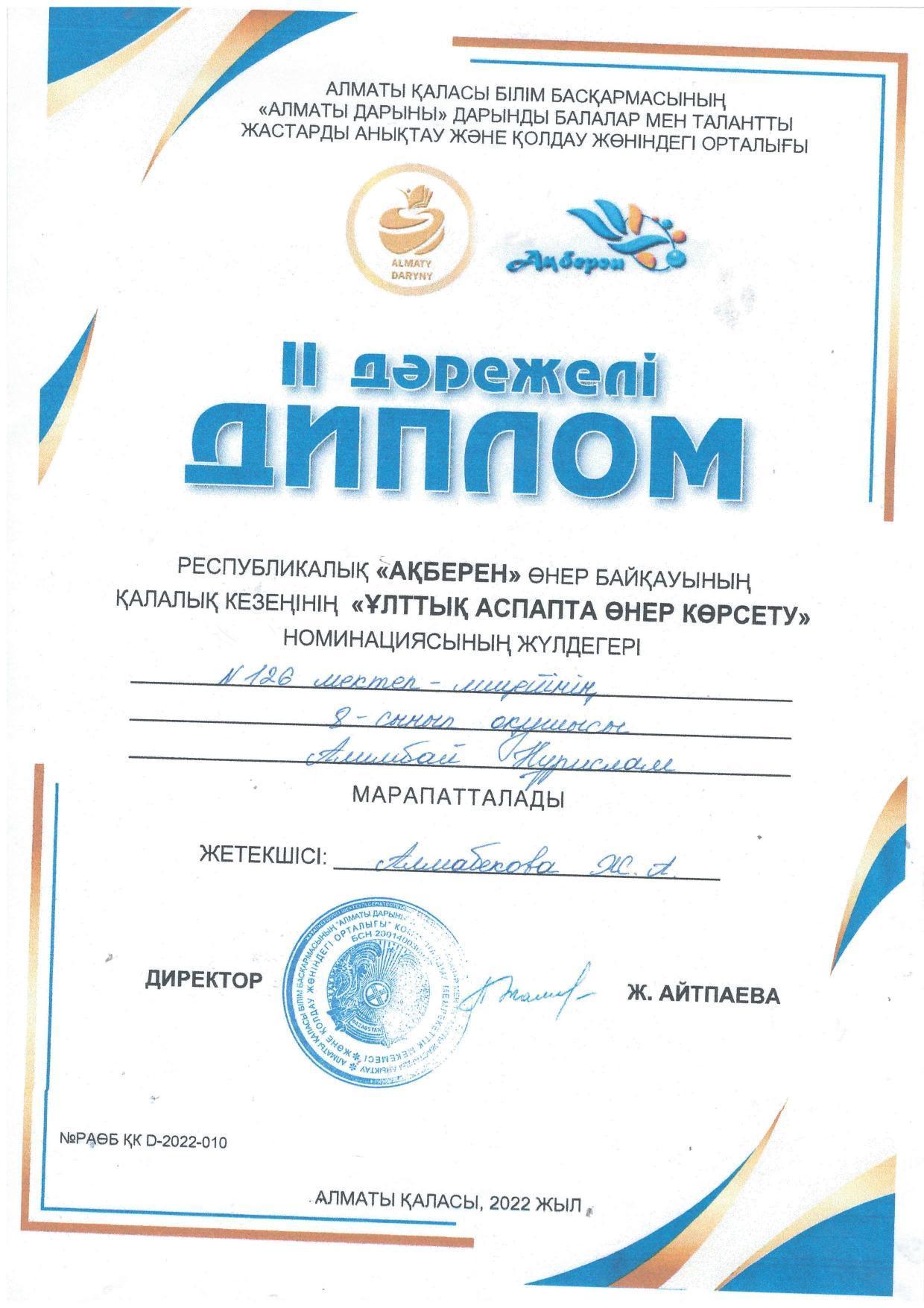 Шығармашыл оқушылар арасындағы республикалық «Ақберен» өнер байқауының қалалық кезеңінің 2-орын жеңімпазы Алимбай Нұрисламды ҚҰТТЫҚТАЙМЫЗ!