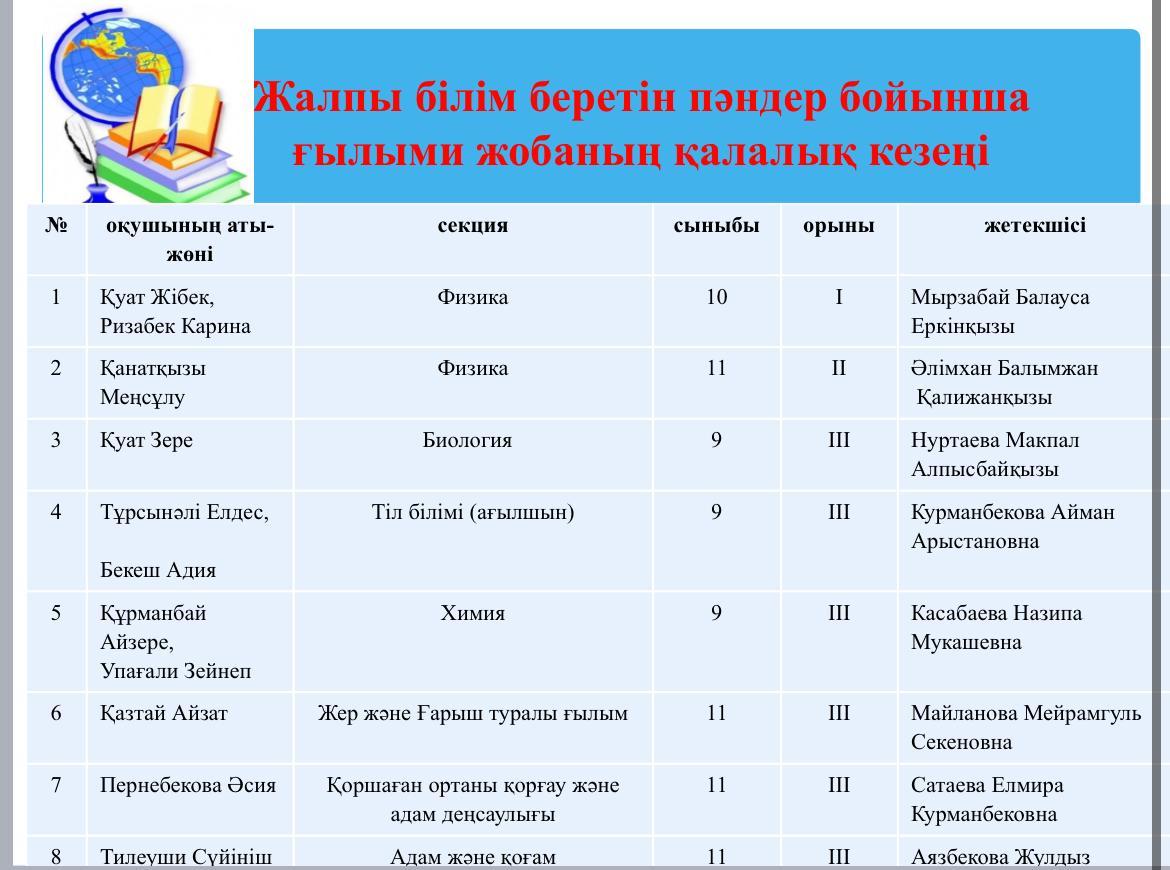 Жалпы білім беретін пәндер бойынша ғылыми жобаның қалалық кезеңінде 8 жоба I,II,III орындарды иеленді. Оқушыларымызды құттықтаймыз !!!