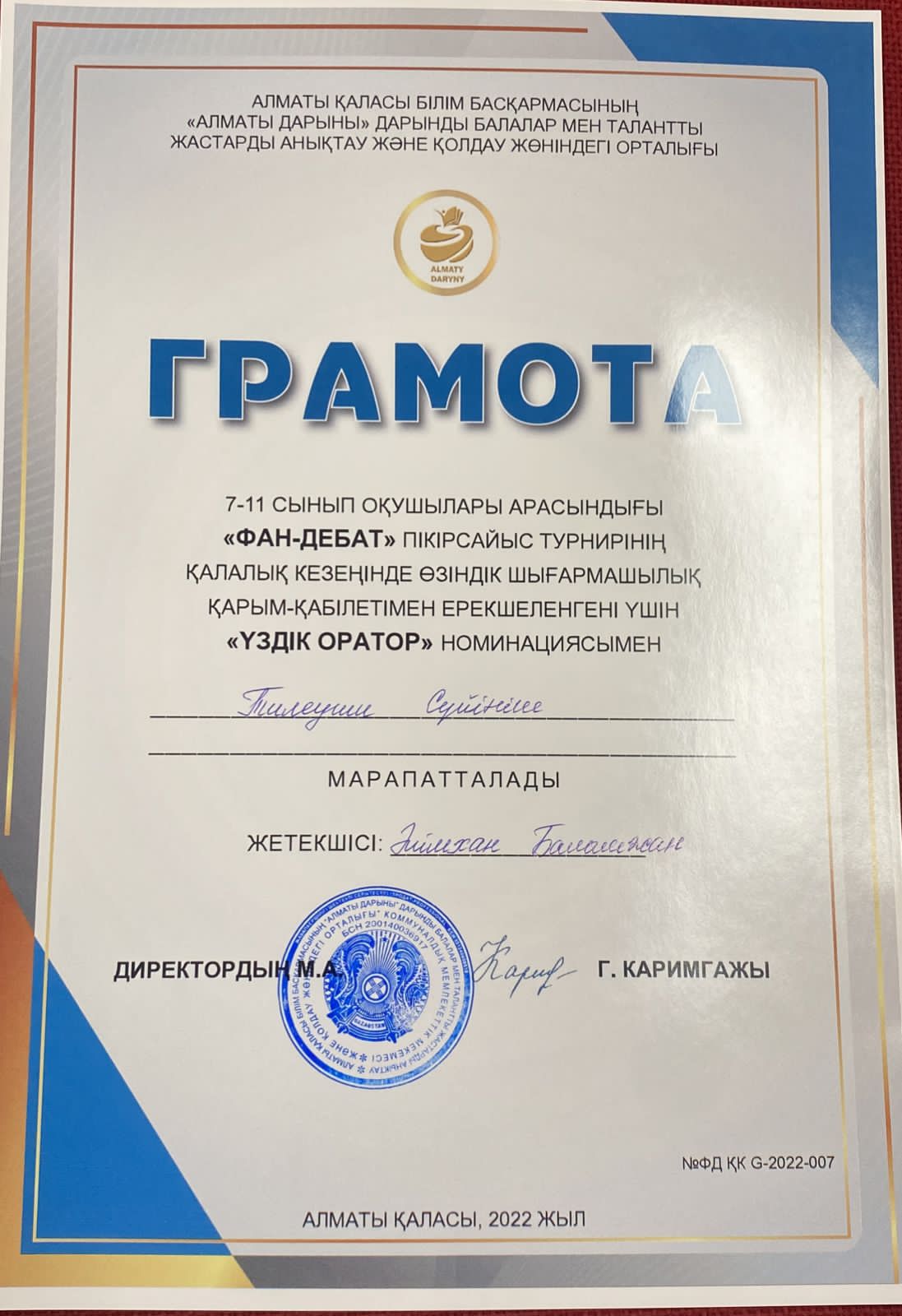 "Фан-Дебат" пікірсайыс турнирінің қалалық кезеңінде өзіндік шығармашылық қарым-қабілетімен ерекшеленгені үшін "Үздік Оратор"номинациясымен Тилеуши Сүйініш марапатталады. Құттықтаймыз!