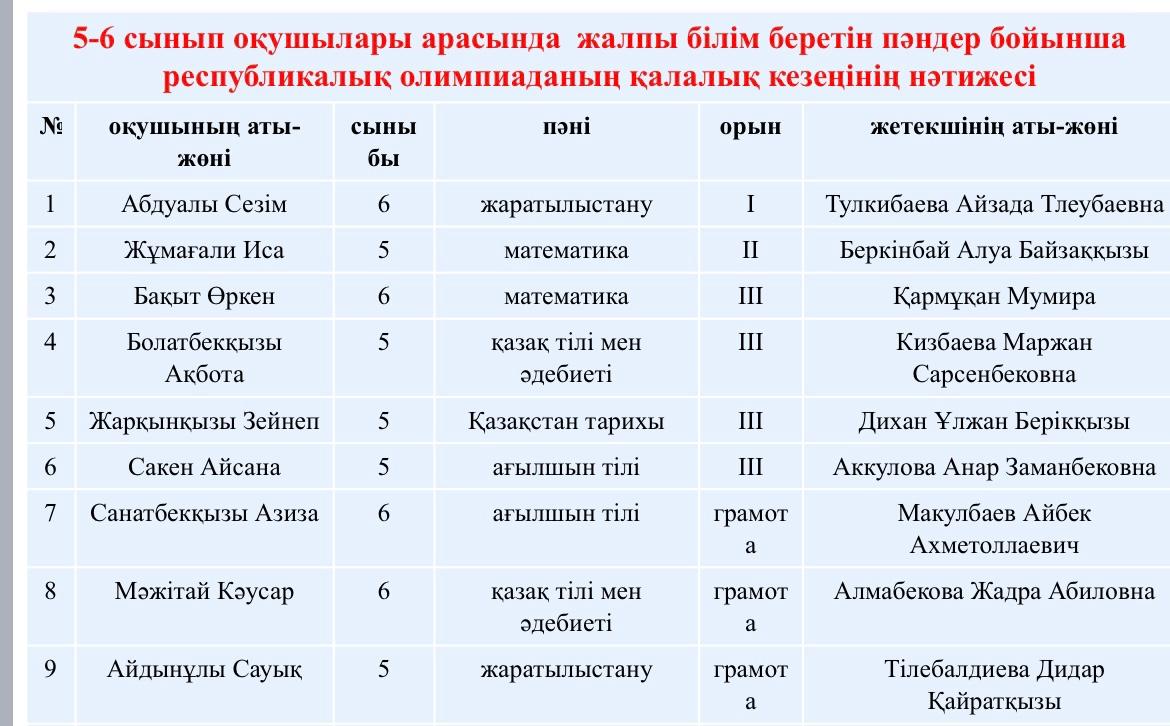 5-6 сынып оқушылары арасында жалпы білім беретін пәндер бойынша республикалық олимпиаданың қалалық кезеңінің жеңімпаздарын құттықтаймыз!