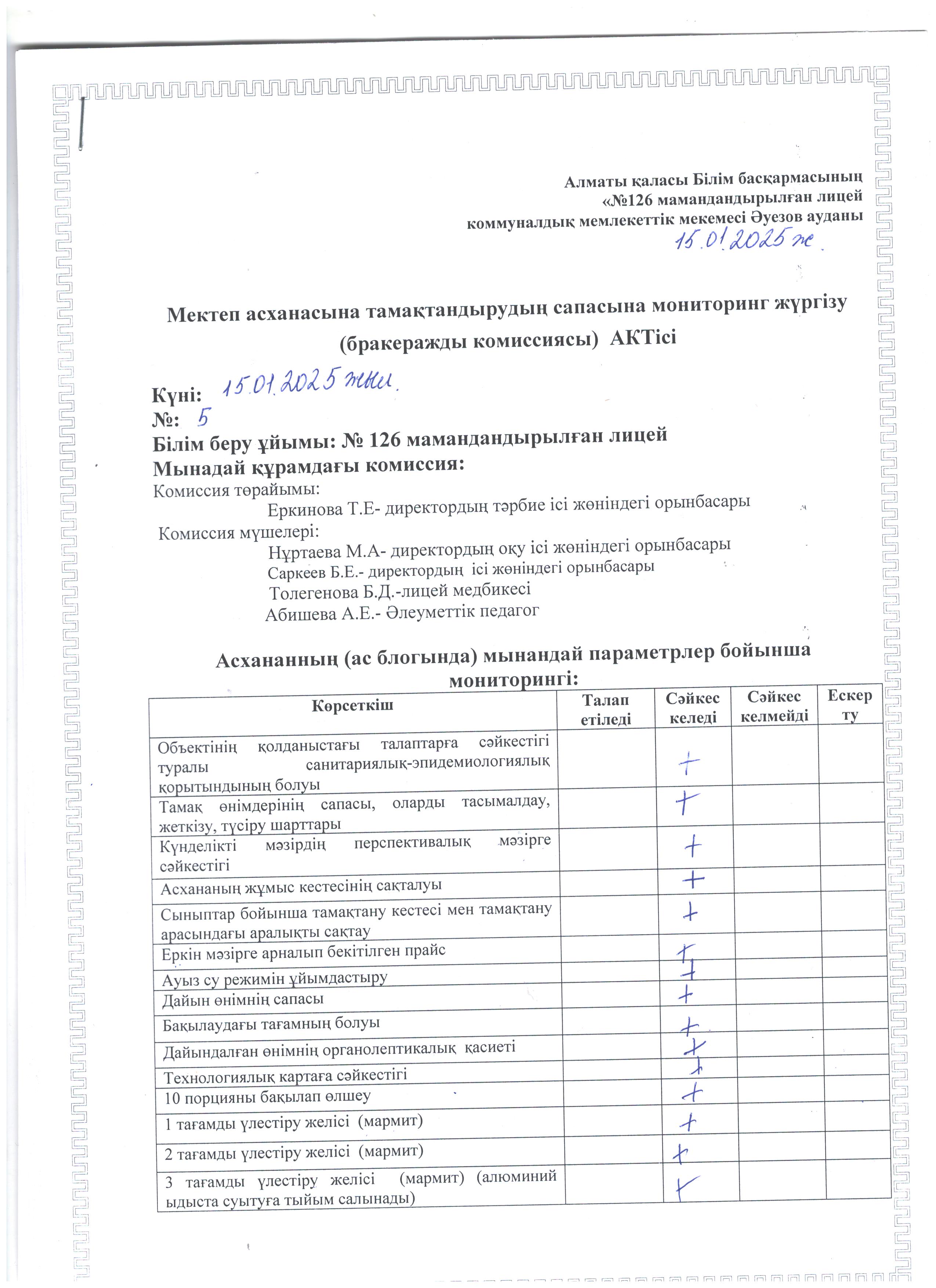 126.alschool » Тамақтандыру » Мектеп асхансфына тамақтандырудың сапасын мониторинг жүргізу (бракеражды комисссиясы) АКТ-сі