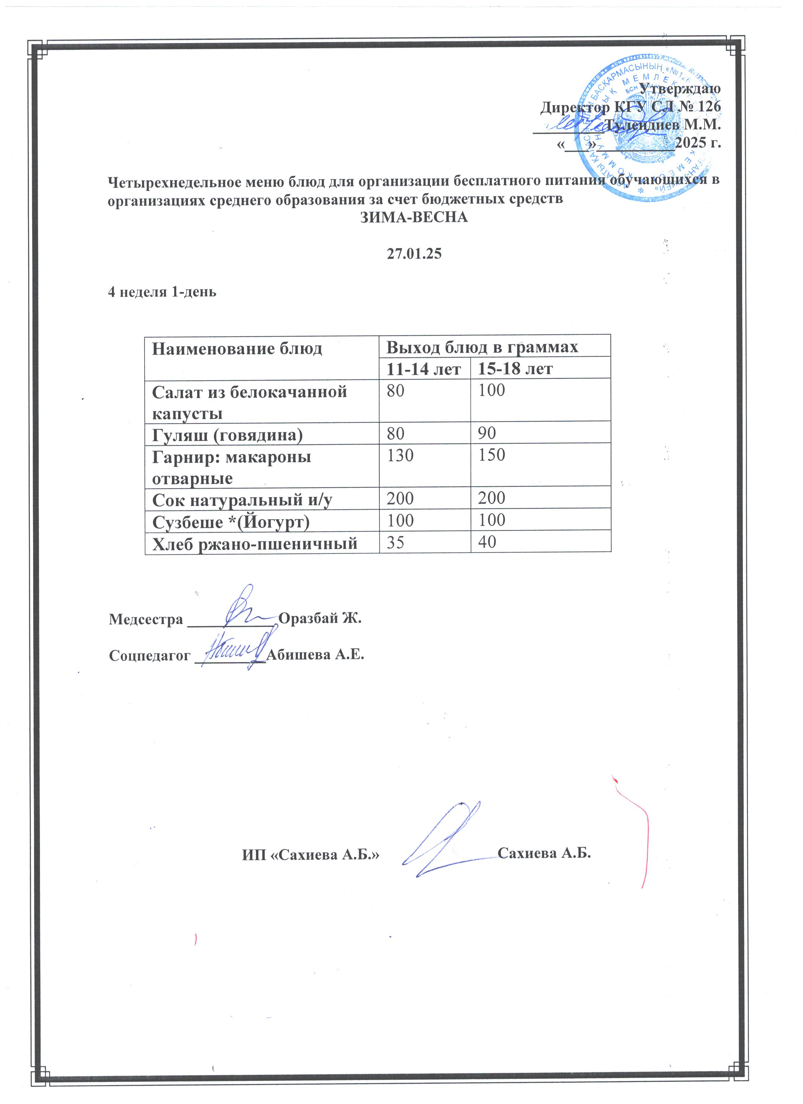 126.alschool » Тамақтандыру » Жалпыға міндетті білім беру қоры есебінен бір мезгіл ыстық тамақтандырудың күнделікті төртапталық ас мәзірі Қыс-көктем 4 апта 1 күн