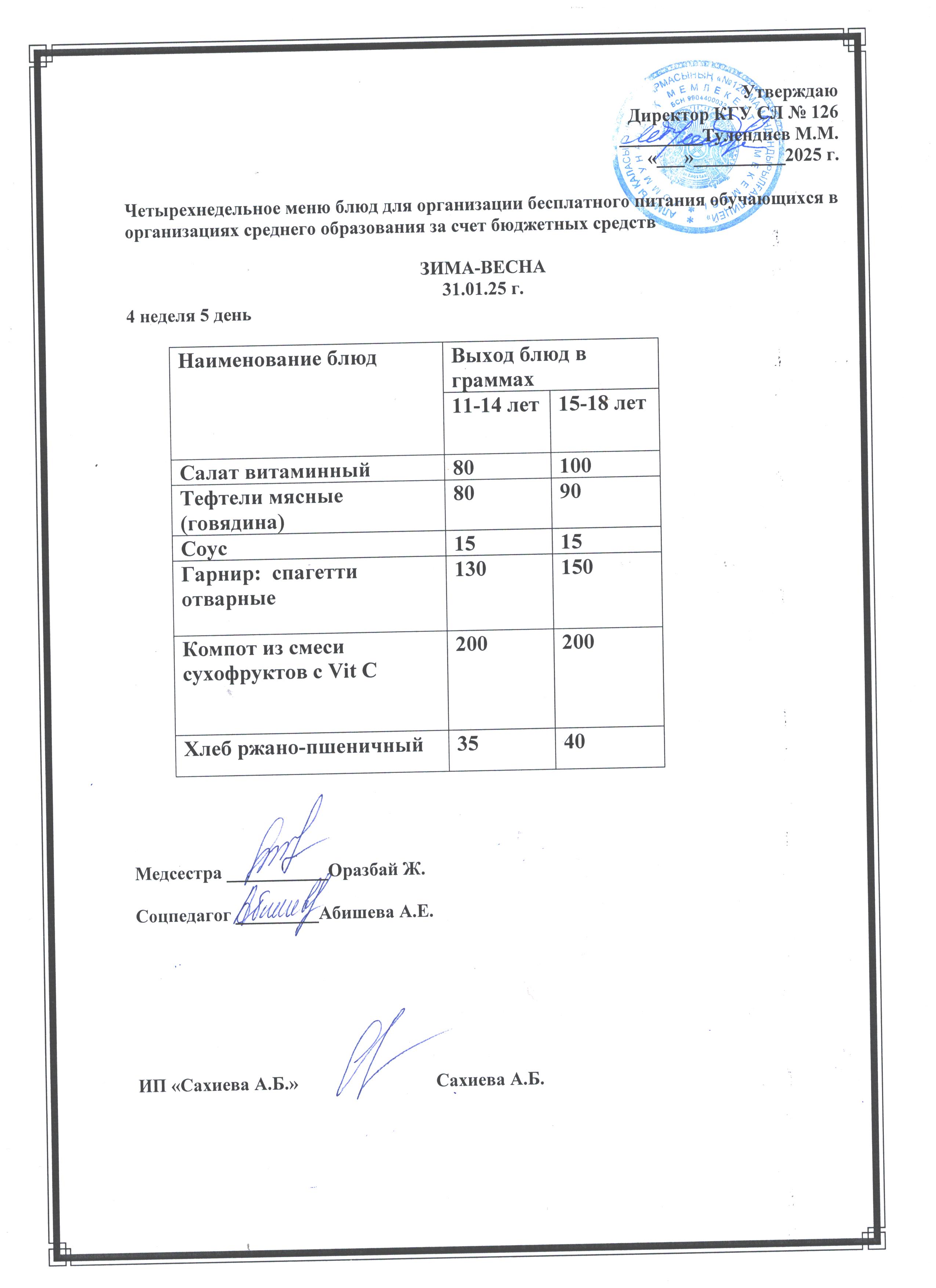 126.alschool » Тамақтандыру » Жалпыға міндетті білім беру қоры есебінен бір мезгіл ыстық тамақтандырудың күнделікті төртапталық ас мәзірі Қыс-көктем 4 апта 5 күн