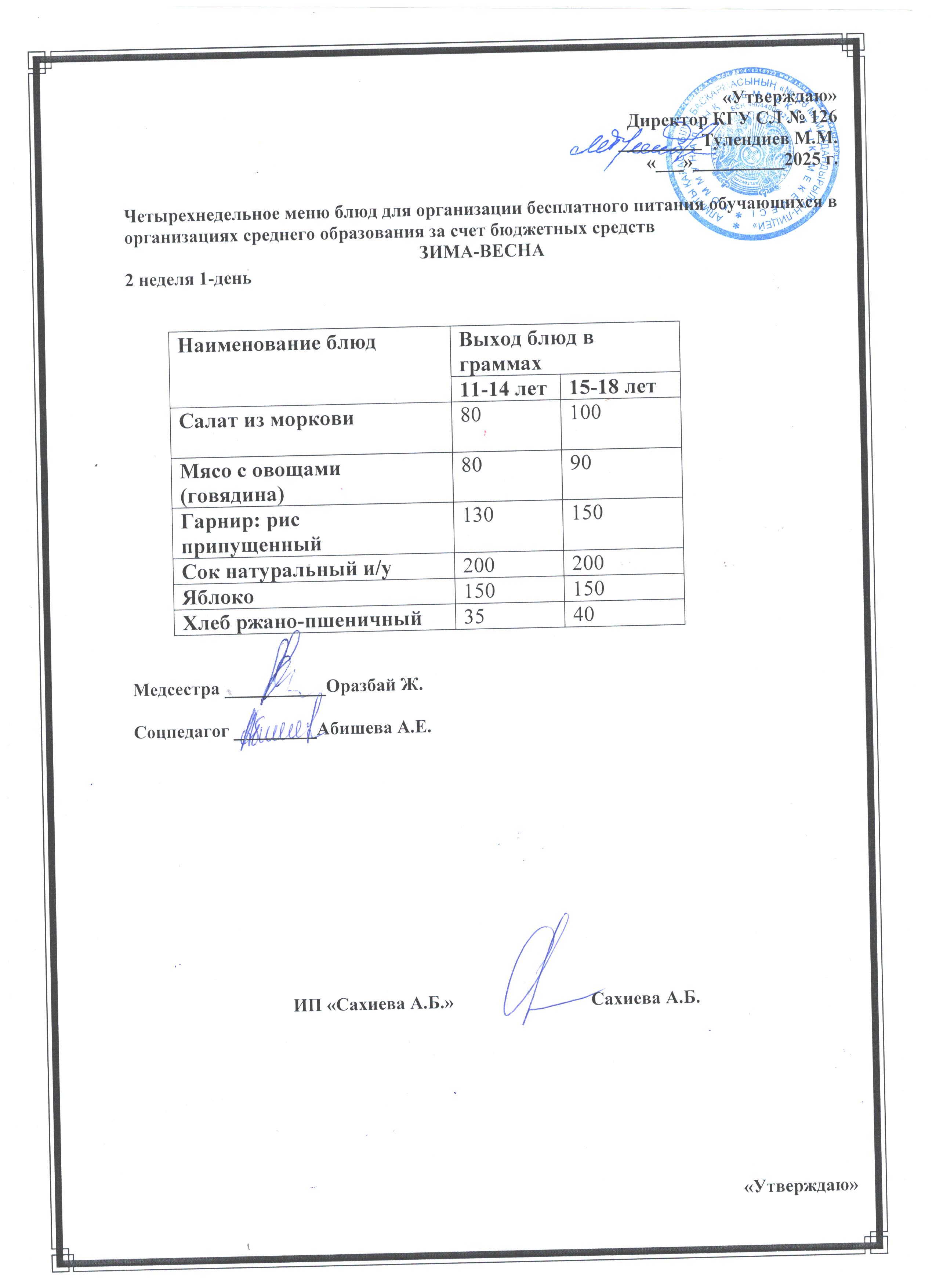 126.alschool » Тамақтандыру » Жалпыға міндетті білім беру қорынан бір мезгіл ыстық тамақтың ас мәзірі ҚЫС-КӨКТЕМ 2 апта 1 күн