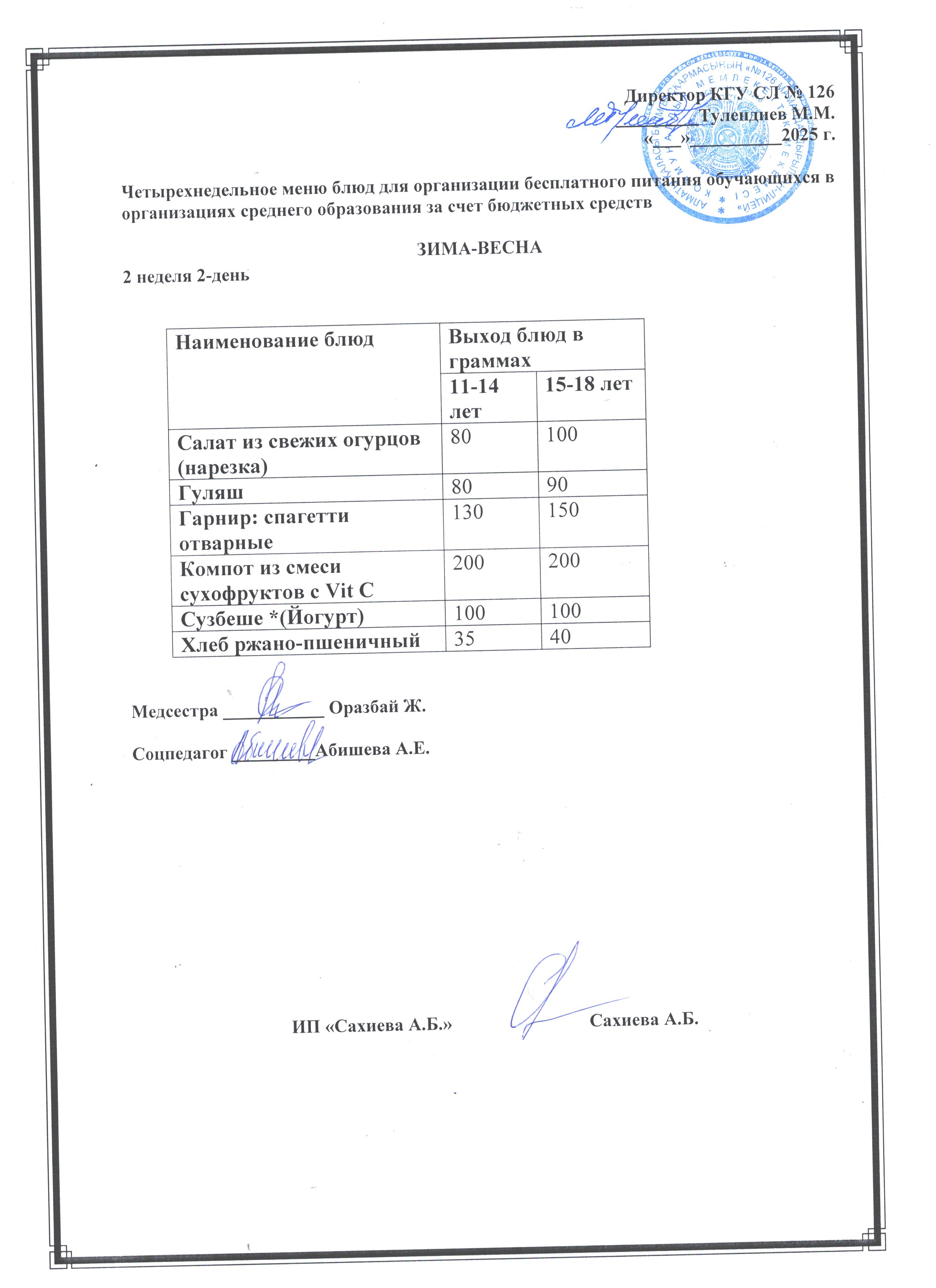 Жалпыға міндетті білім беру қорынан бір мезгіл ыстық тамақтың ас мәзірі ҚЫС-КӨКТЕМ 2 апта 2 күн