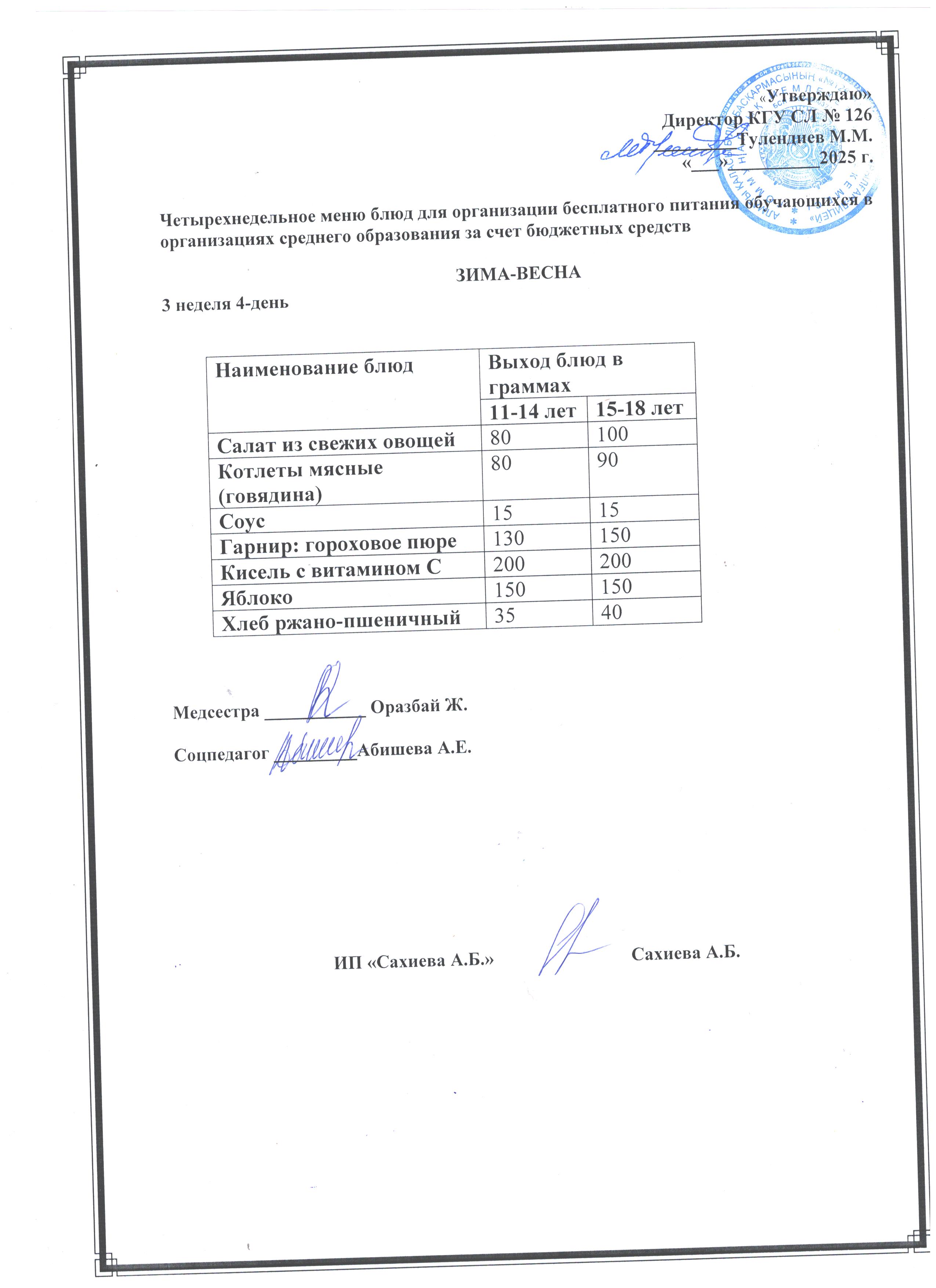 126.alschool » Тамақтандыру » Жалпыға міндетті білім беру қорынан бір мезгіл ыстық тамақтың ас мәзірі ҚЫС-КӨКТЕМ 3 апта 4 күн