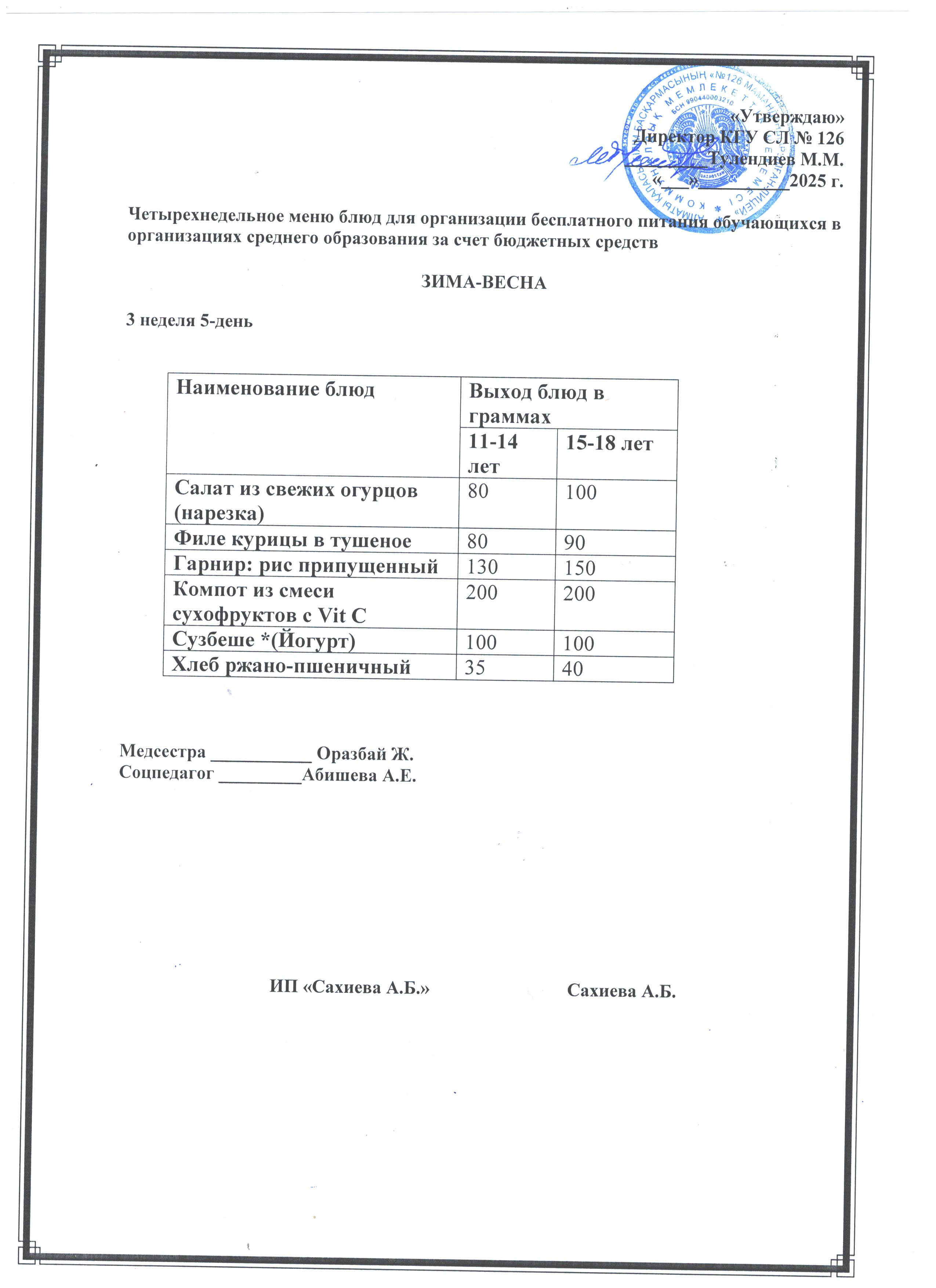 126.alschool » Тамақтандыру » Жалпыға міндетті білім беру қорынан бір мезгіл ыстық тамақтың ас мәзірі ҚЫС-КӨКТЕМ 3 апта 5 күн