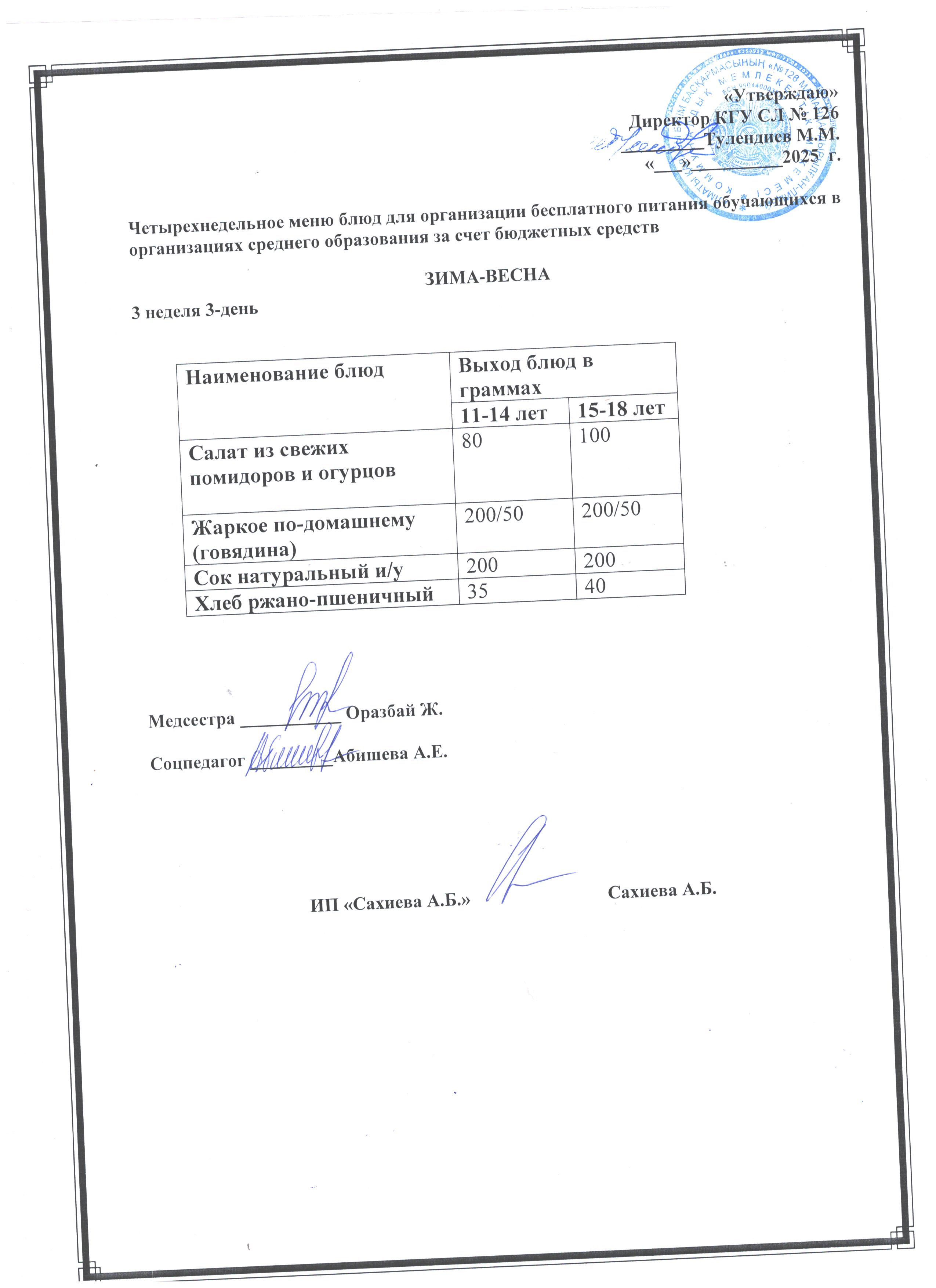 126.alschool » Тамақтандыру » Жалпыға міндетті білім беру қорынан бір мезгіл ыстық тамақтың ас мәзірі ҚЫС-КӨКТЕМ 3 апта 3 күн