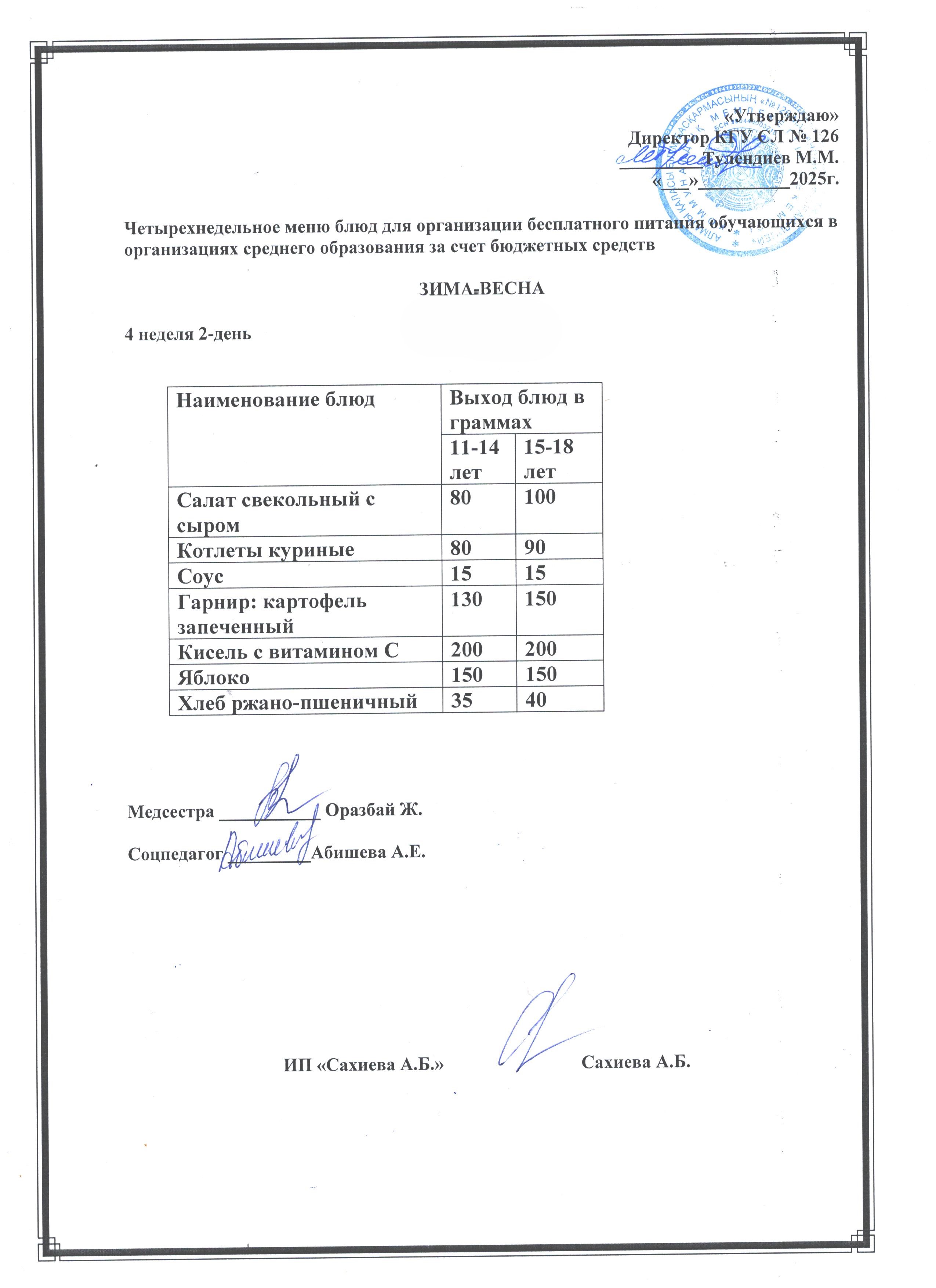 126.alschool » Тамақтандыру » Жалпыға міндетті білім беру қорынан бір мезгіл ыстық тамақтың ас мәзірі ҚЫС-КӨКТЕМ 4 апта 2 күн