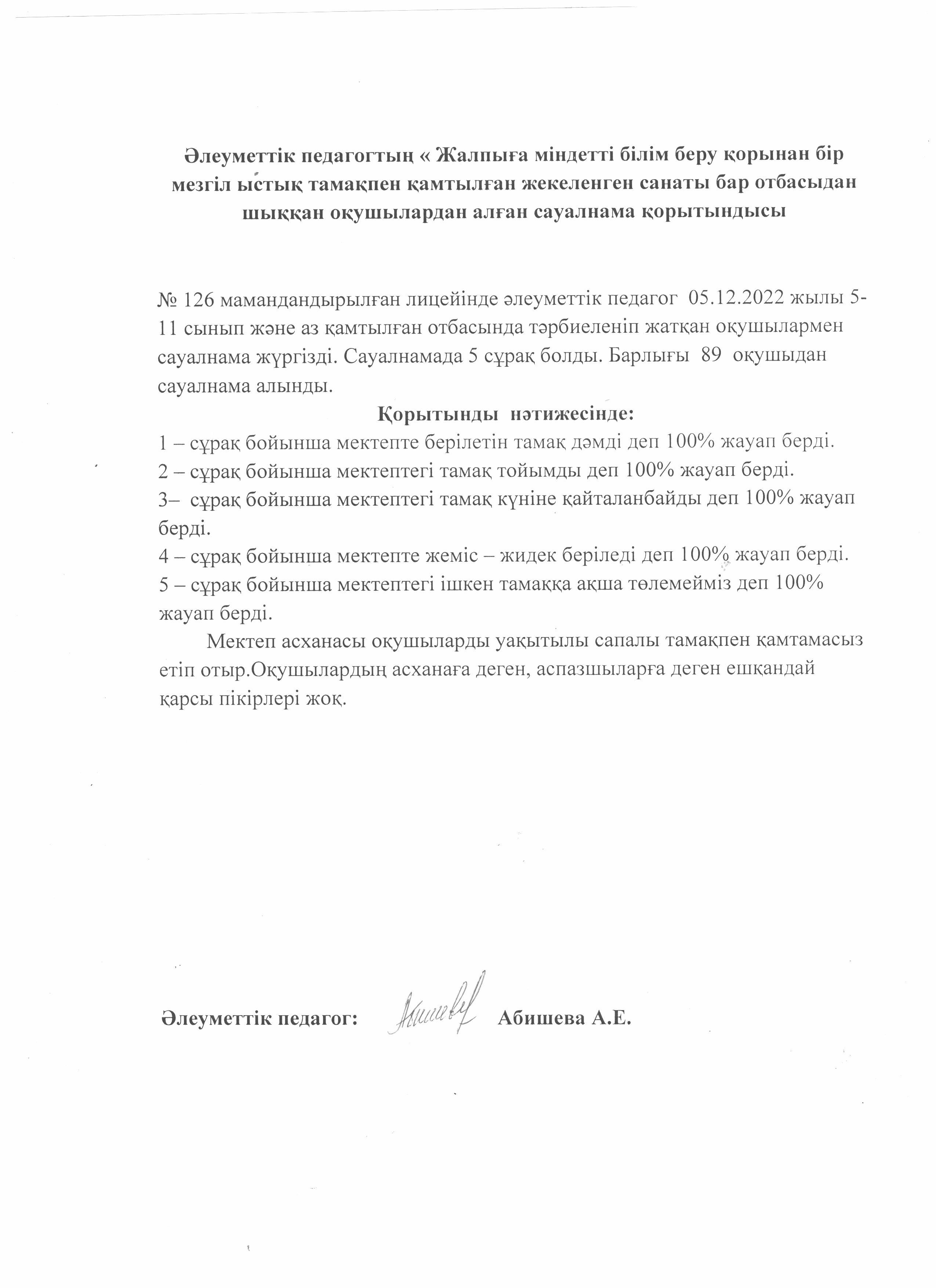 № 126 мамандандырылған лицейде берілетін бір мезгіл ыстық тамақ ішетін оқушыларға арналған сауалнама нәтижесі